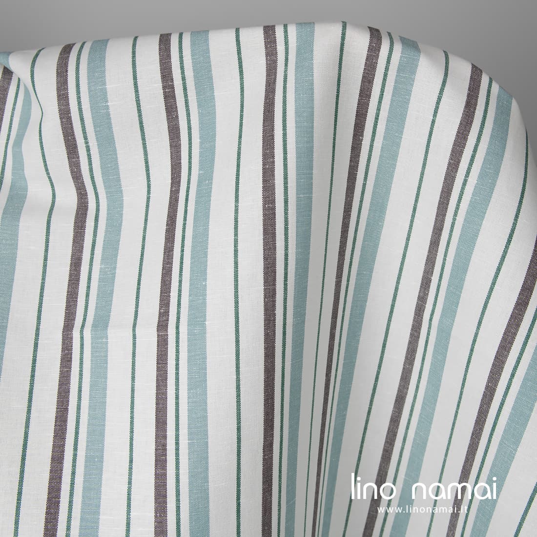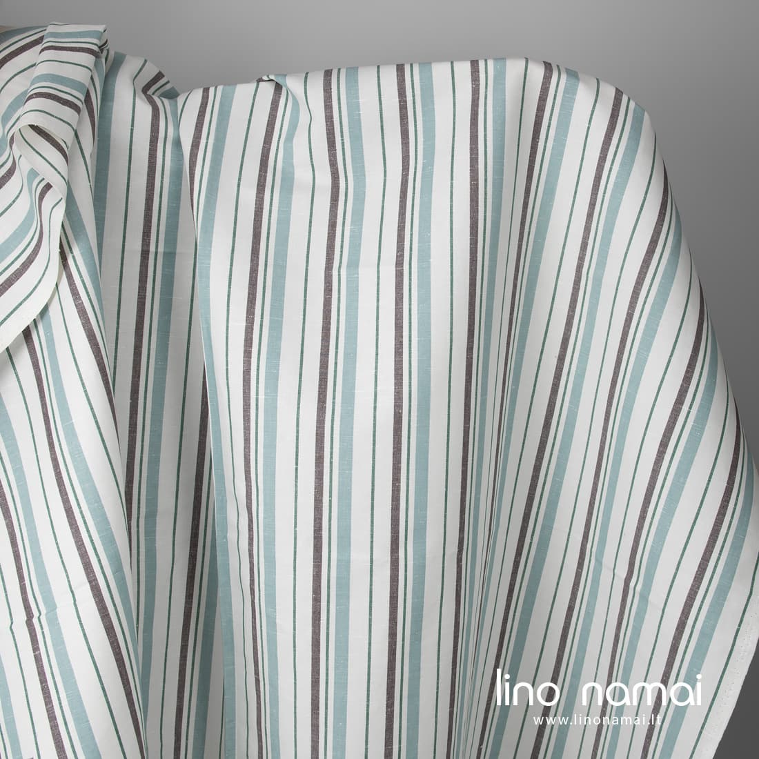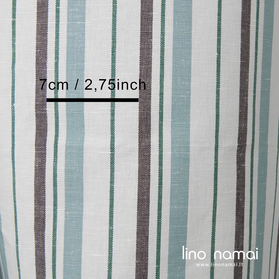 Dryžuotas pieno baltumo (gelsvai baltas) lino / medvilnės sudėties audinys. Vertikalioms juostoms išausti naudoti tamsiai žali, akvamarino spalvos (melsvai žalsvi) ir tamsiai rudi verpalai. Sunkus, storas, tvirtas ir patvarus audinys, kuriam naudotos žalsvos spalvos, puikiai tiks, pvz., paplūdimio rinkiniui (patiesalui ir rankinei) siūti.