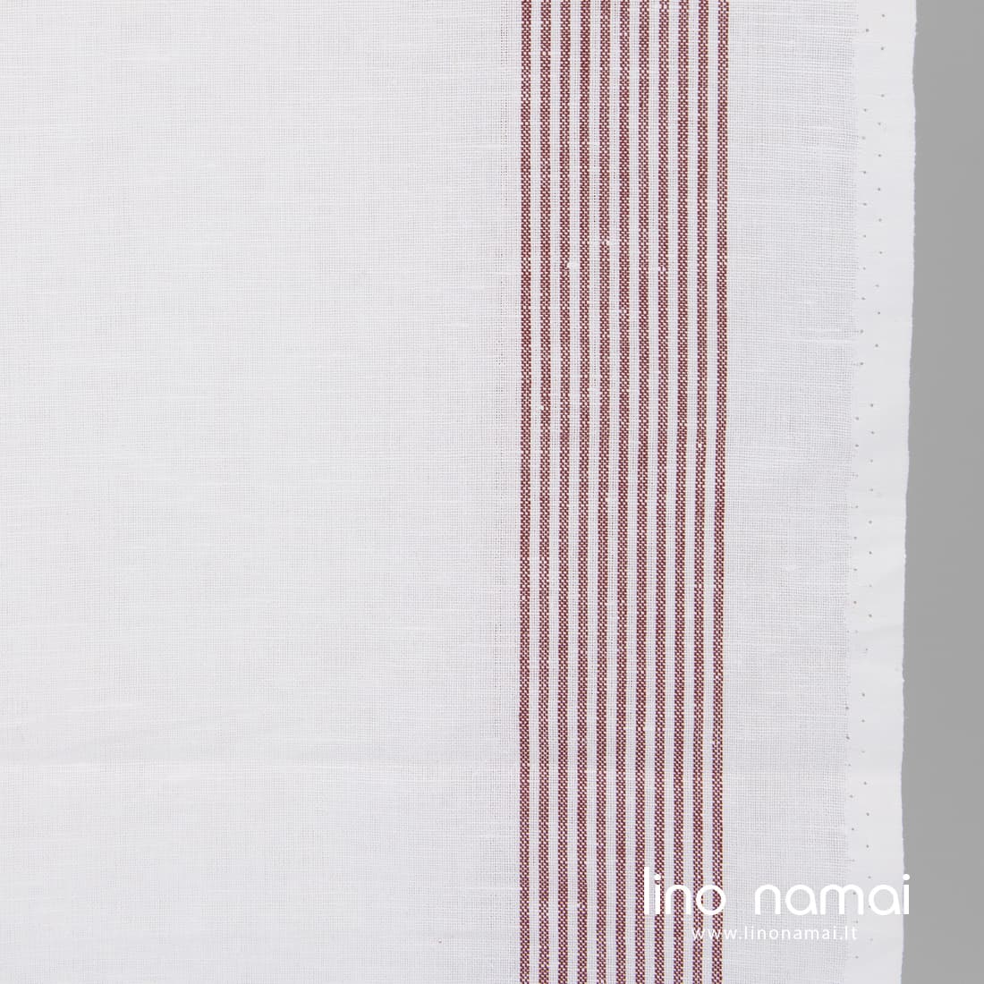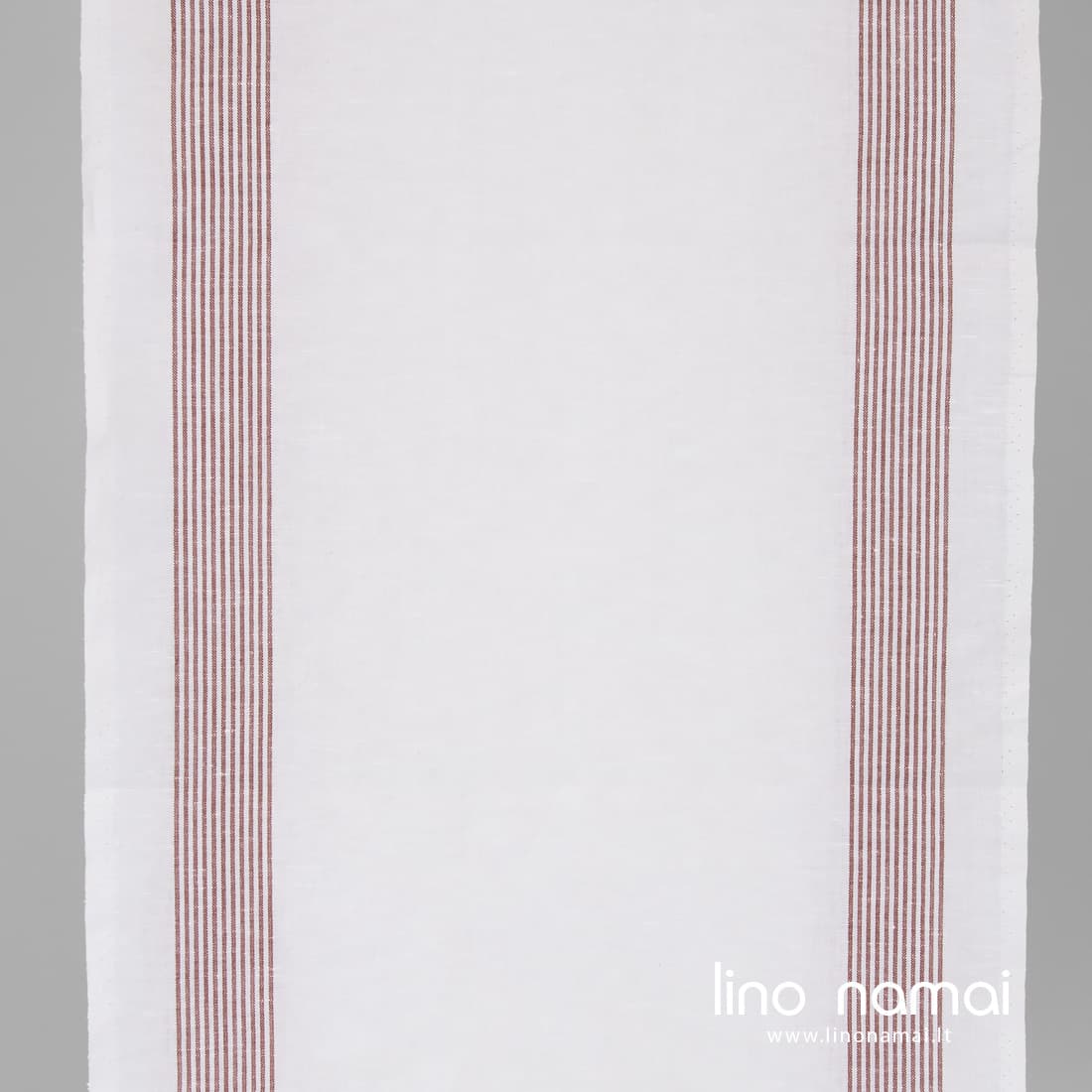 Ryškiai baltas puslininis audinys rudomis su raudonu atspalviu juostelėmis kraštuose. Plotis 50cm. Lengvas, tvirtas, tankus lino - medvilnės audinys puikiai tinka virtuvės rankšluostukams siūti.