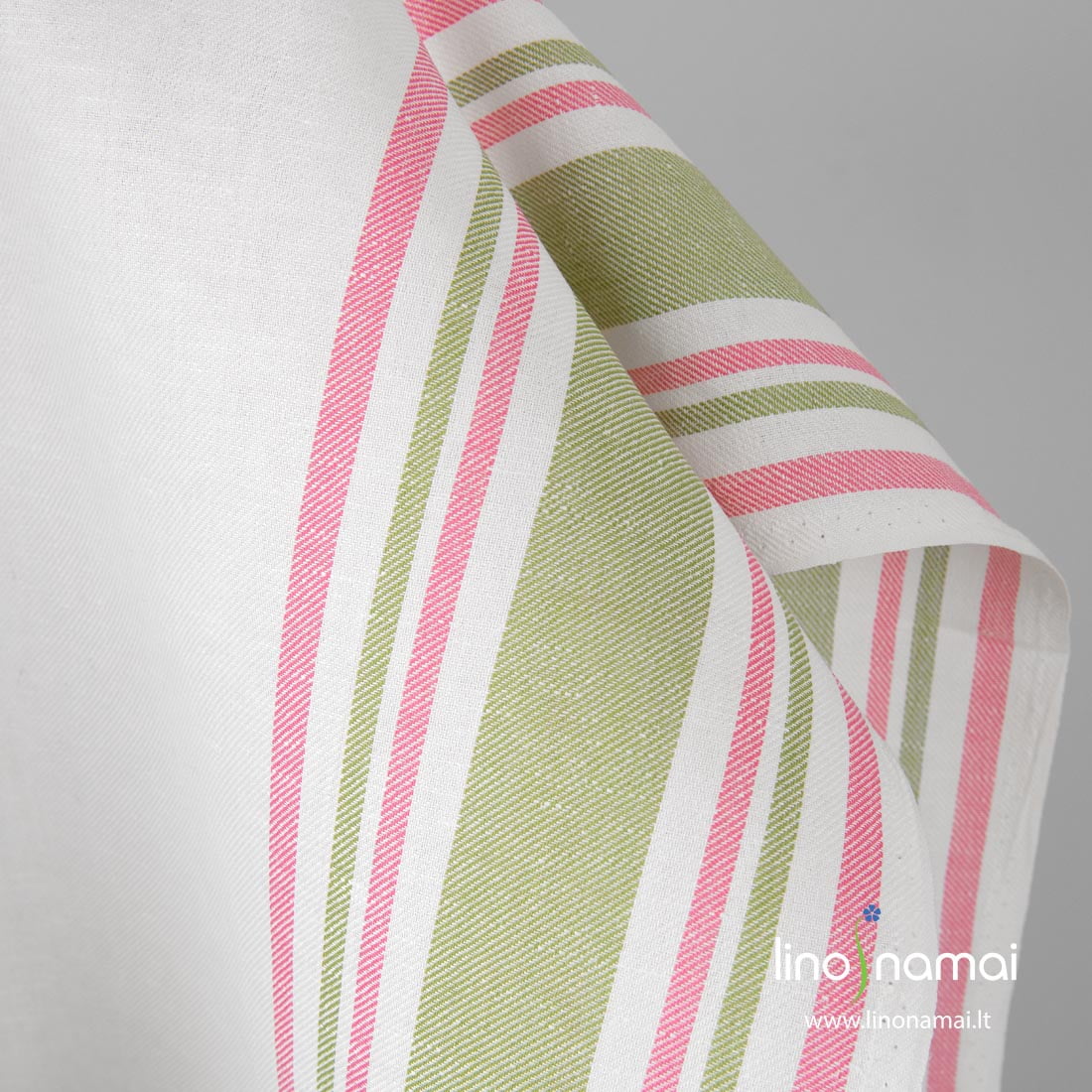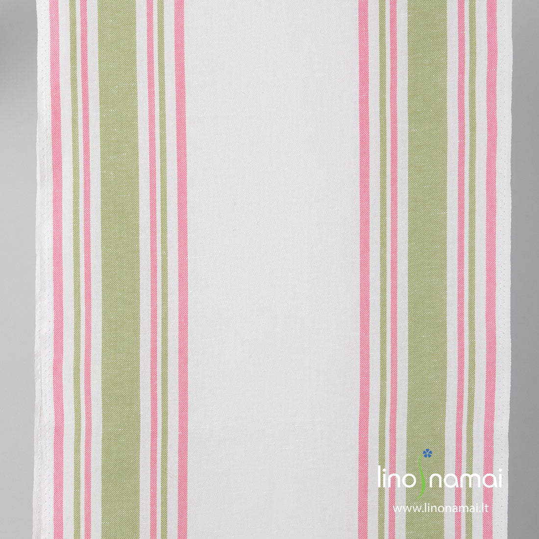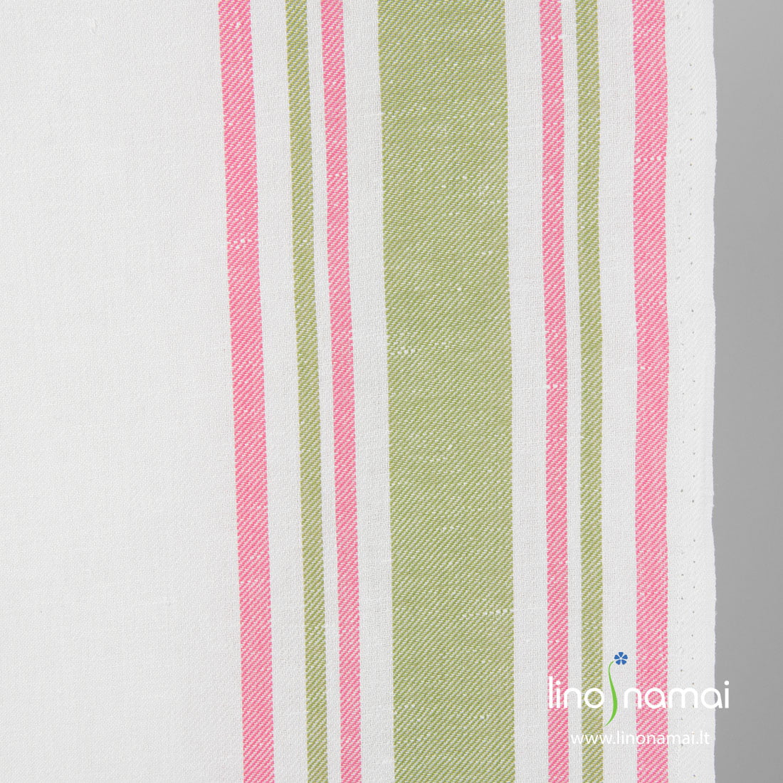 Gelsvai baltas (pieno spalvos) puslininis rankšluostinis audinys žaliomis, rožinėmis juostelėmis kraštuose. Austas įstrižais ruoželiais, tvirtas, tankus, vidutinio storio, puikiai sugeria drėgmę, todėl tinka virtuvės rankšluostukams siūti.