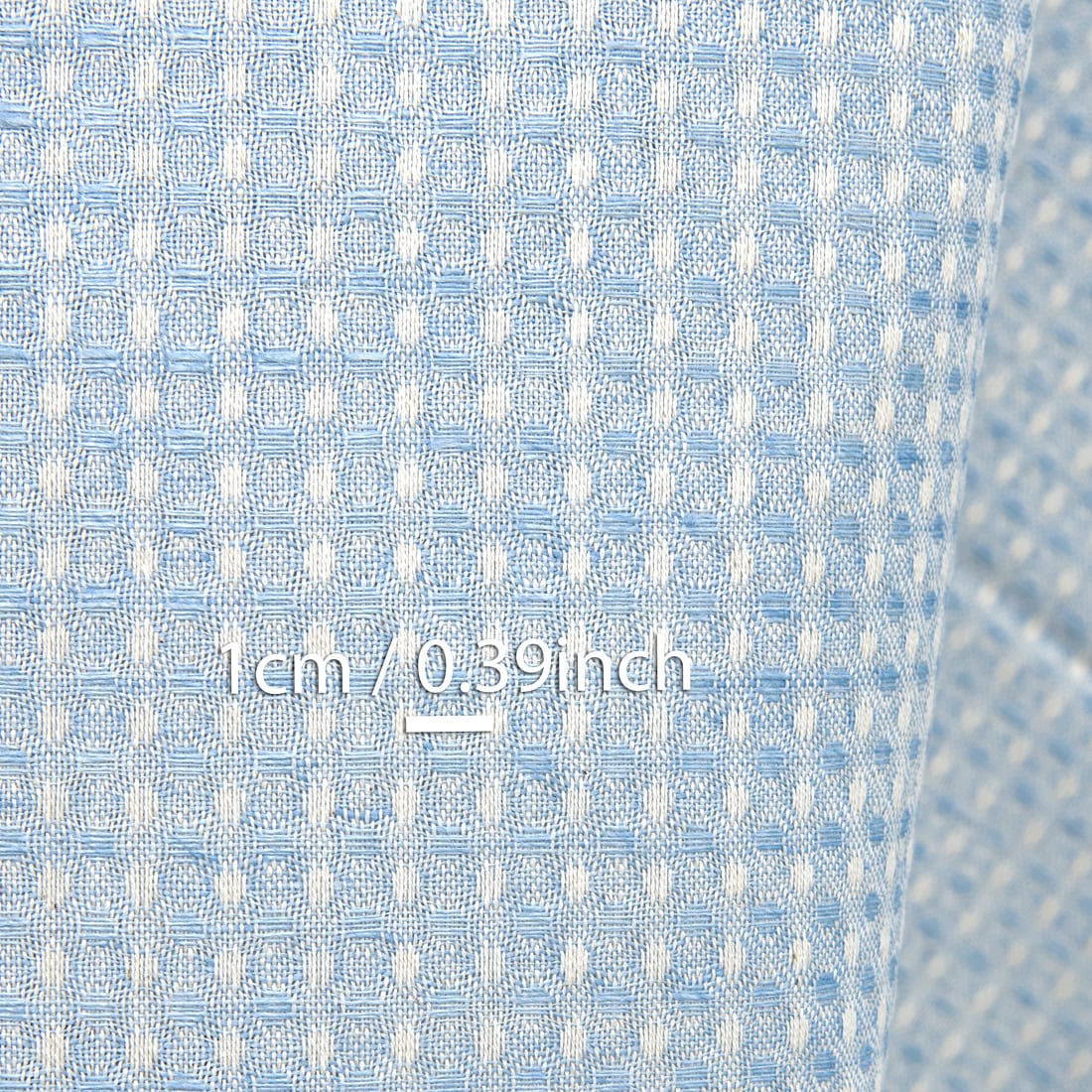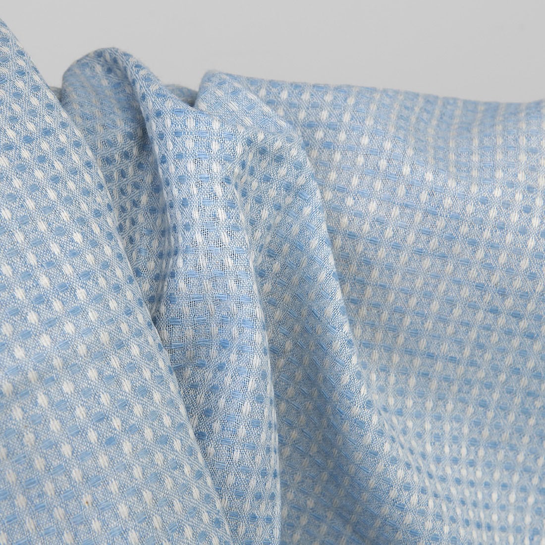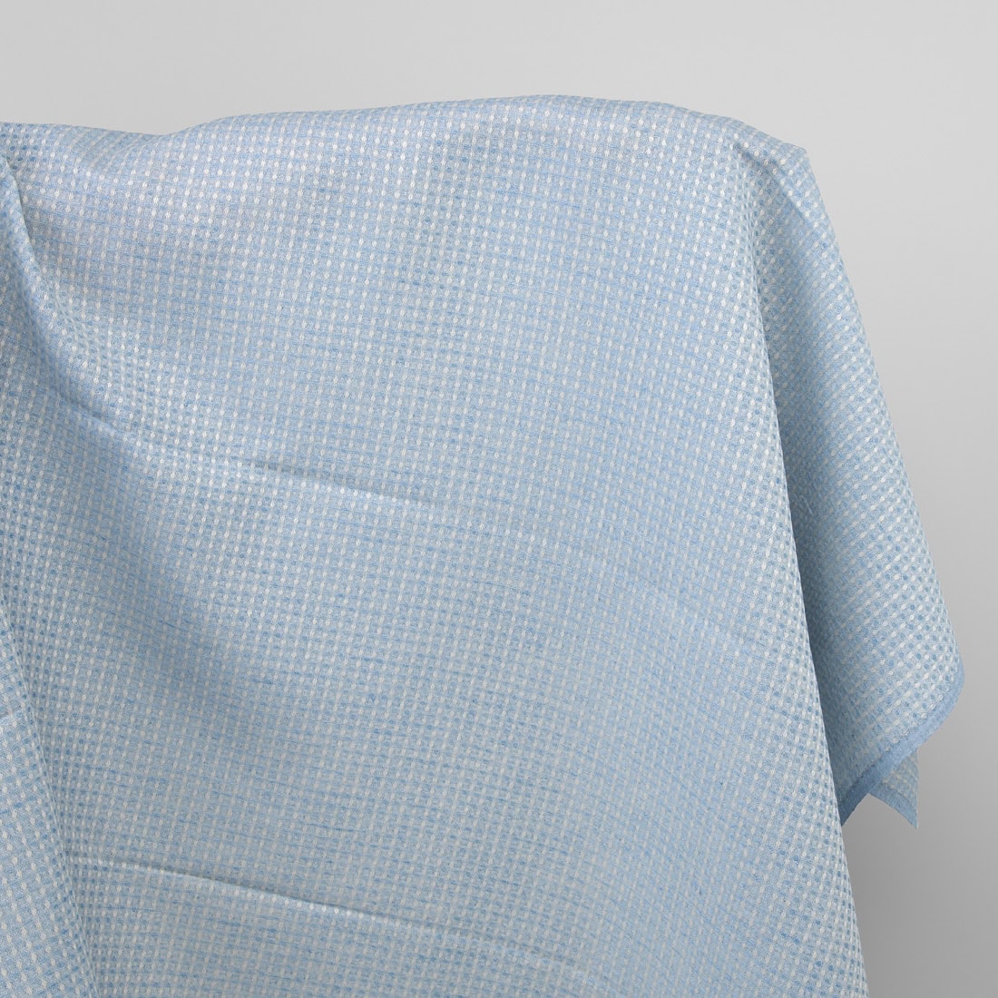 Šviesiai melsvas audinys austas derinant žydros ir baltos spalvos lino/medvilnės verpalus. Tankus, vidutinio sunkumo, mažų langelių raštu austas audinys gali būti labai plačiai panaudotas: siūti stalo ir virtuvės gaminius, patalynę, vaikiškus drabužius, įvairius aksesuarus.