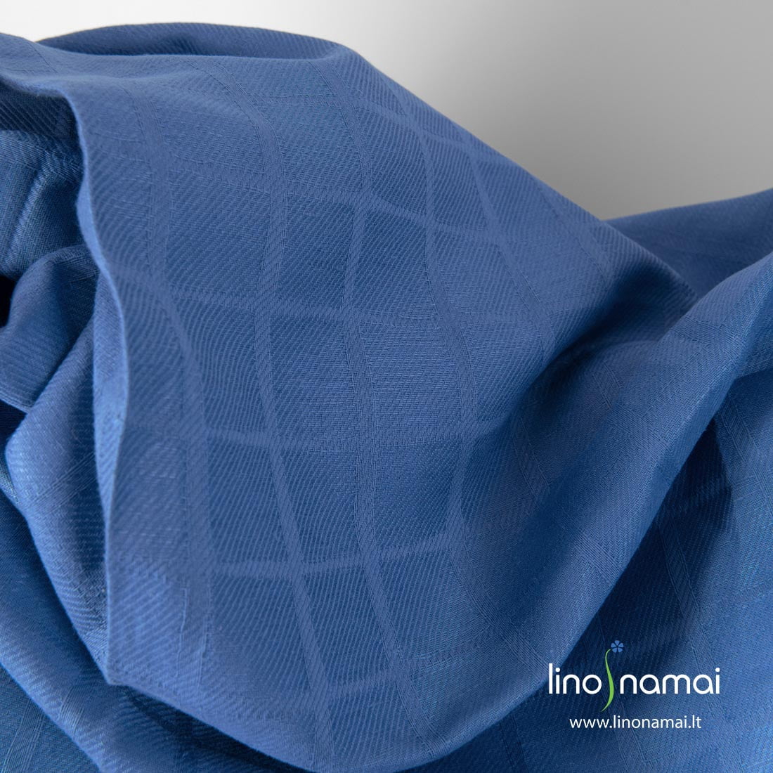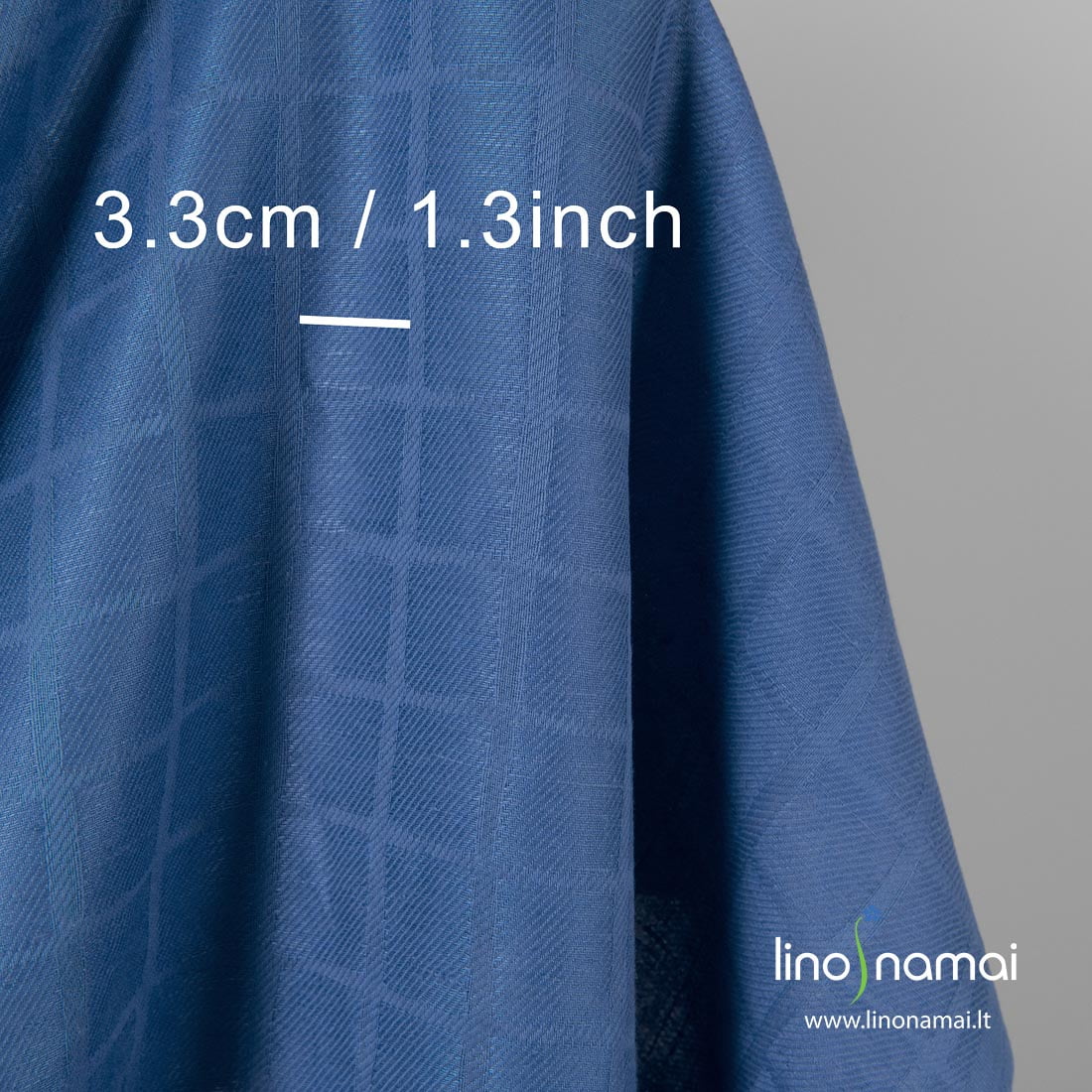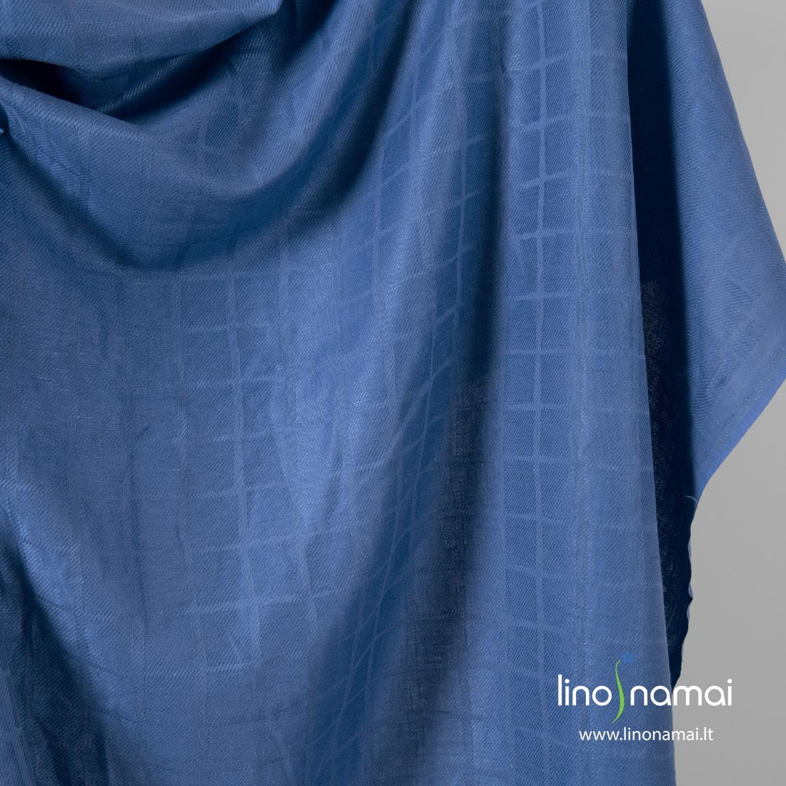 Mėlynas žakardinis lino - medvilnės sudėties audinys, austas įstrižais ruoželiais. Vertikalios ir horizontalios juostelės dalina audinį į 4,2 x 4,5cm dydžio langelius. Tvirtas, tankaus audimo, vidutinio storio puslininis audinys tiks siūti daugeliui gaminių.