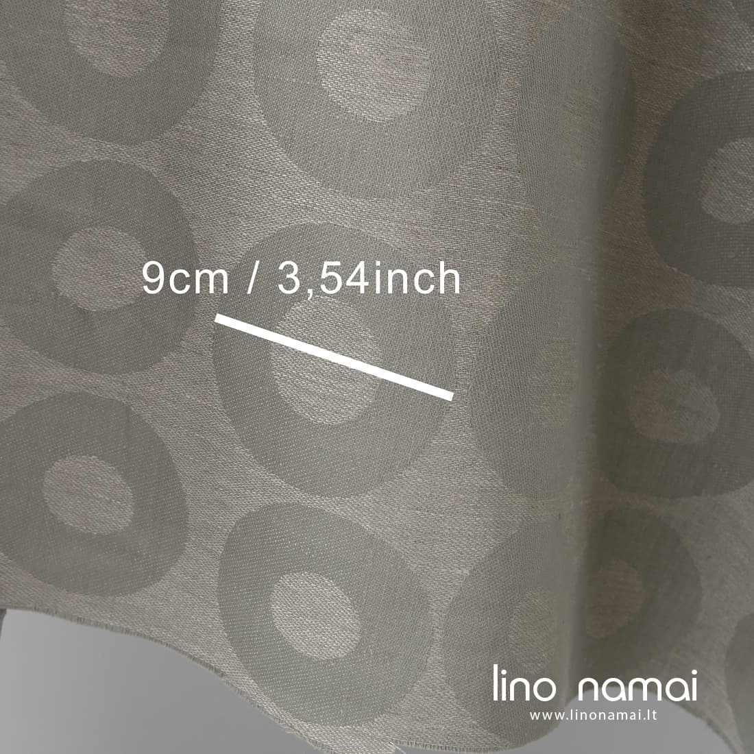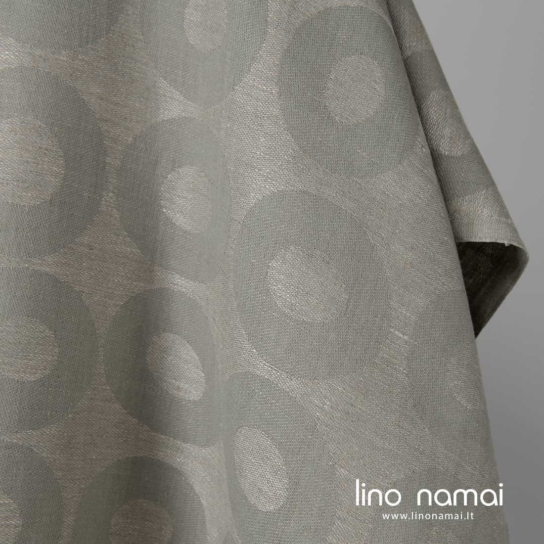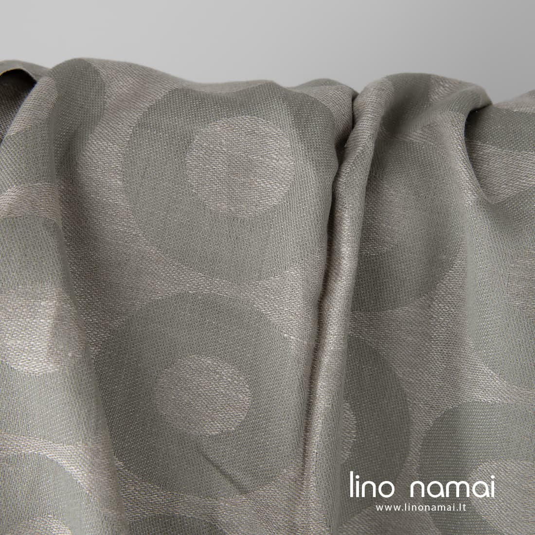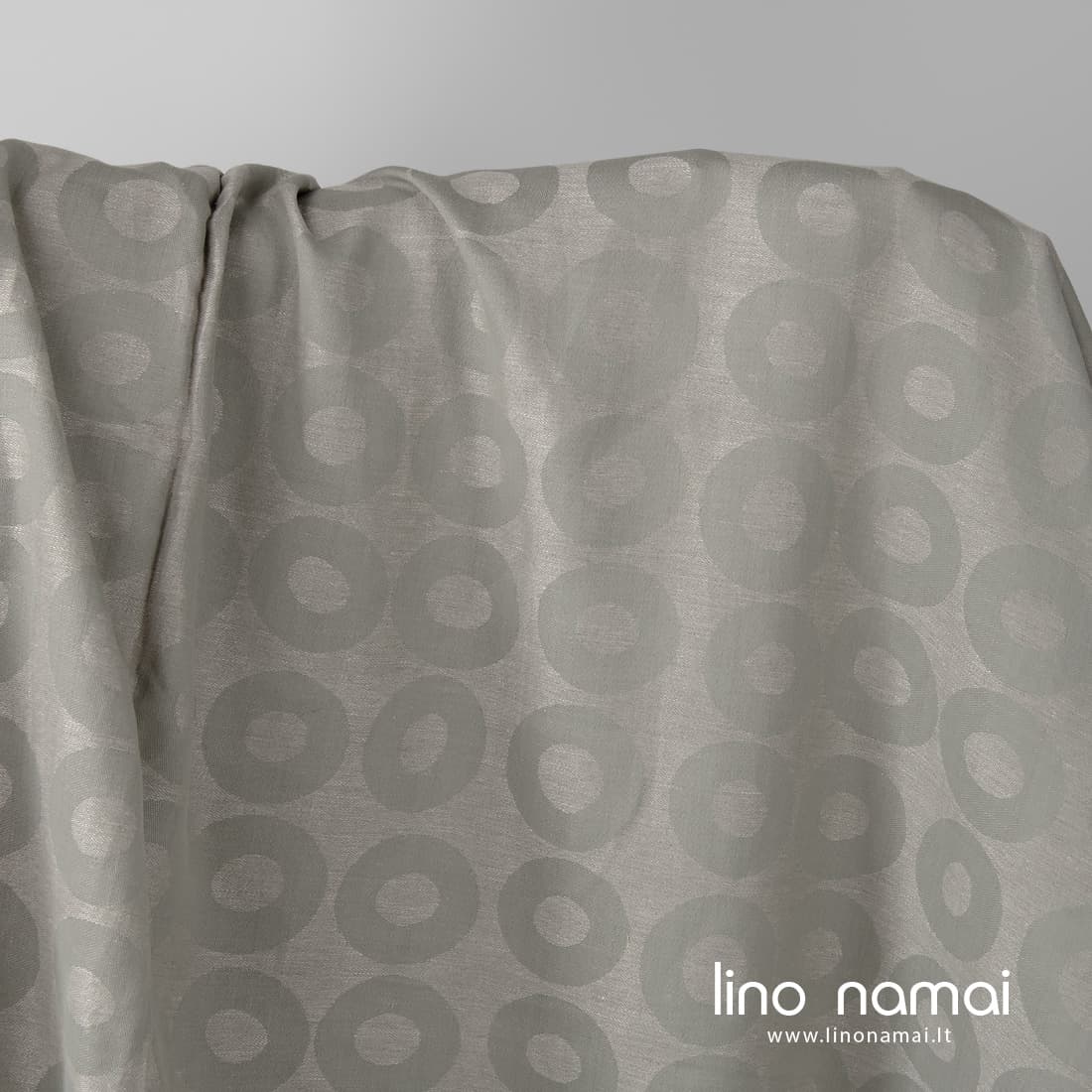 Pilkas, vidutinio sunkumo, tankus žakardinis audinys su apskritimais. Apskritimai skirtingi, skersmens vidurkis 9cm. Šis lino-medvilnės audinys tinka įvairiausiems namų tekstilės gaminiams siūti.