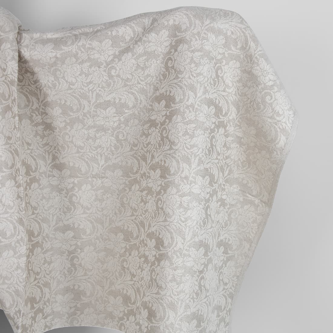 Pilkas lino / medvilnės žakardinis audinys puoštas žydinčiomis baltomis gėlėmis. Audinys vidutinio sunkumo, tankus puikiai tiks siūti lovos užtiesalus, užuolaidas, stalo gaminius ir kitus stilingus namų dekoravimo aksesuarus.