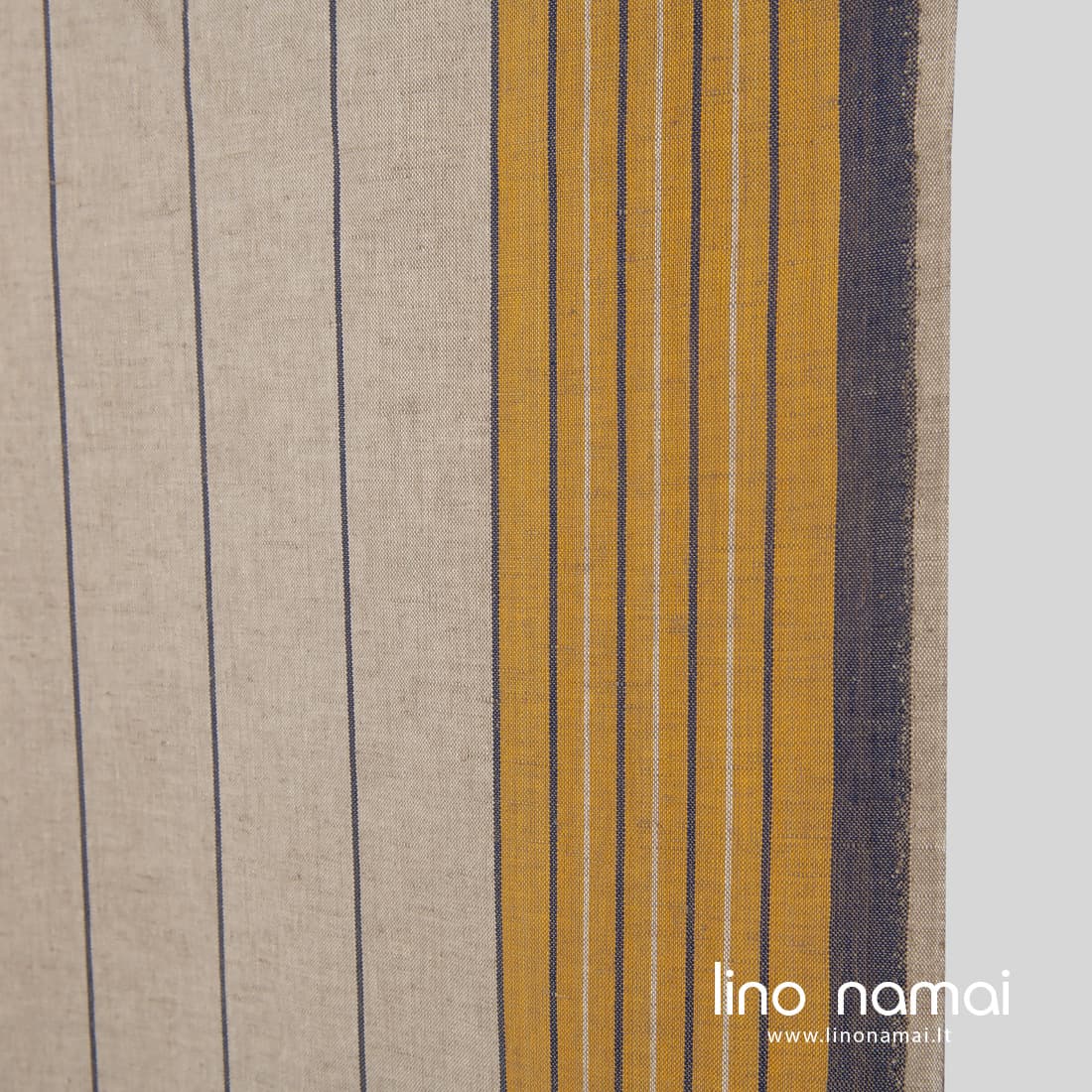 • Lino - medvilnės audinys pilkas su geltonomis ir mėlynomis juostomis virtuvės rankšluosčiams siūti