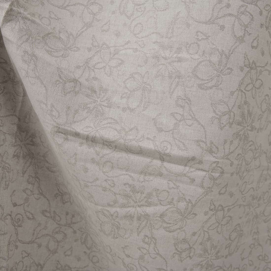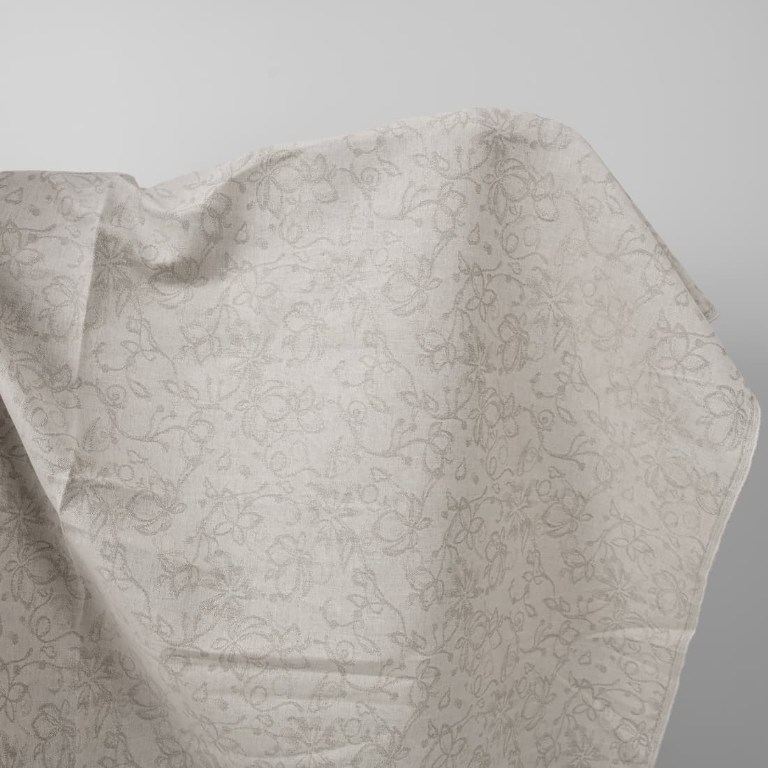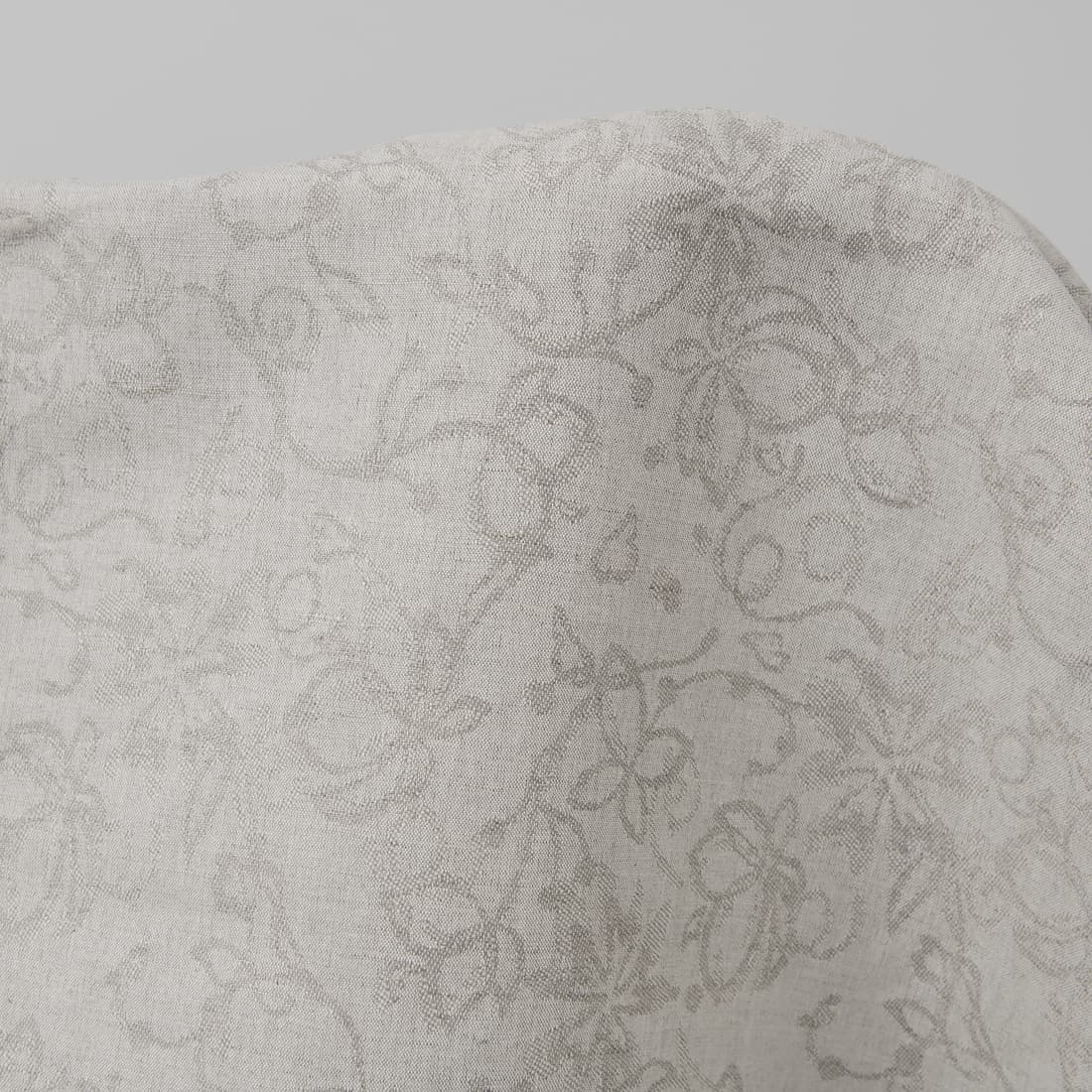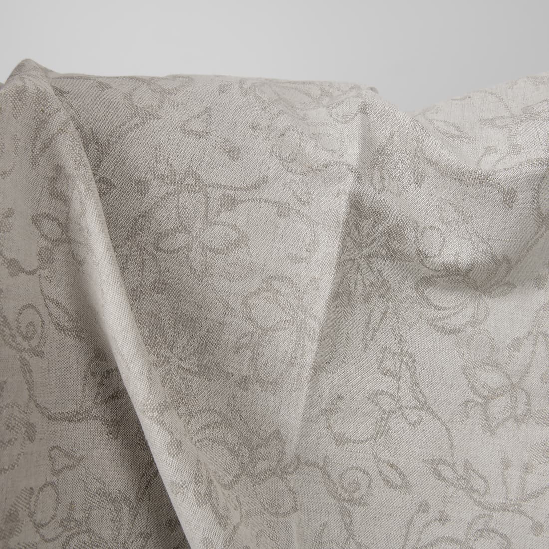 Natūralios lino pilkos spalvos audinys austas augalų motyvu, derinant lino / medvilnės verpalus. Audinys vidutinio sunkumo, tankus puikiai tiks siūti lovos užtiesalus, užuolaidas, stalo gaminius ir kitus stilingus namų dekoravimo aksesuarus.