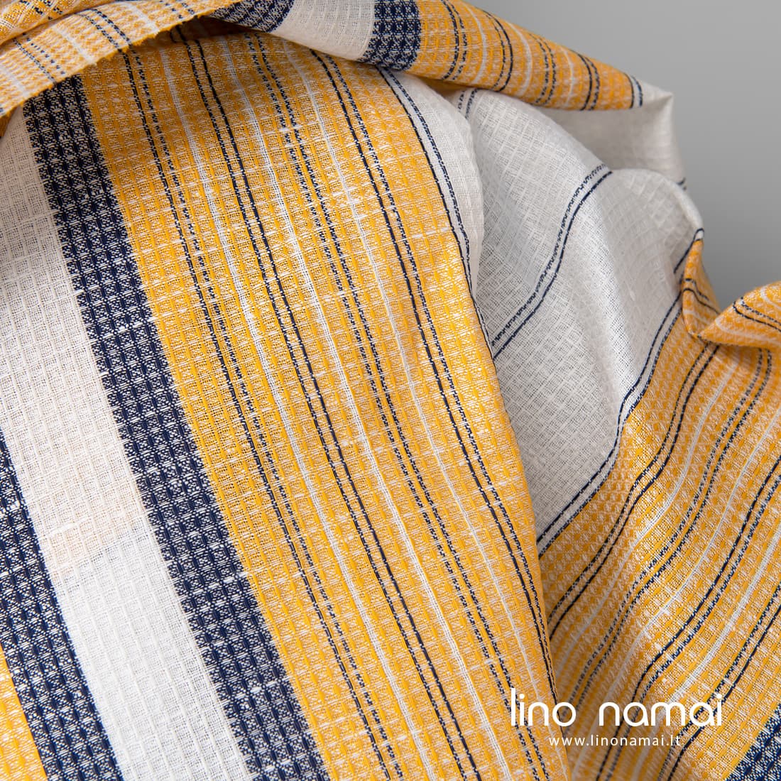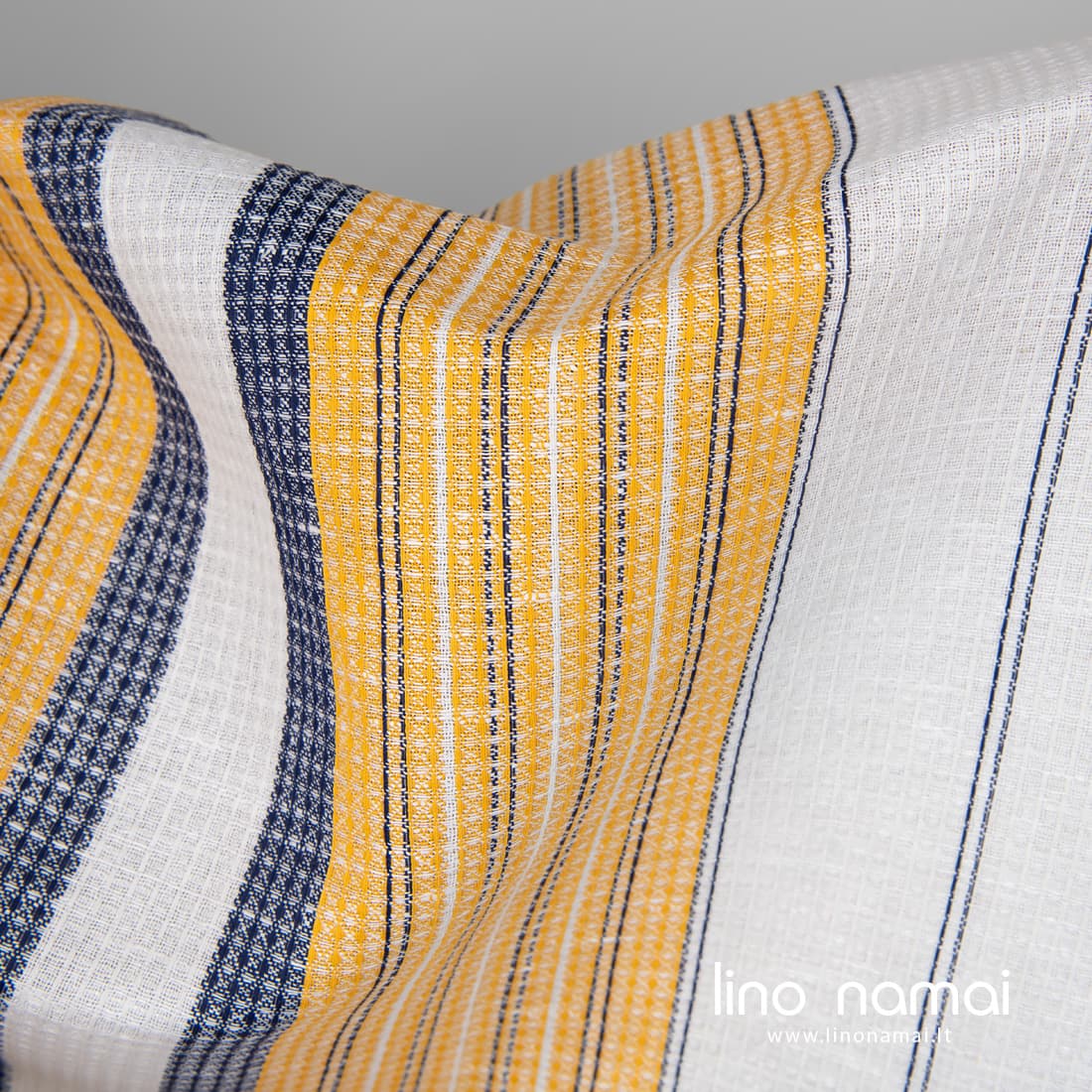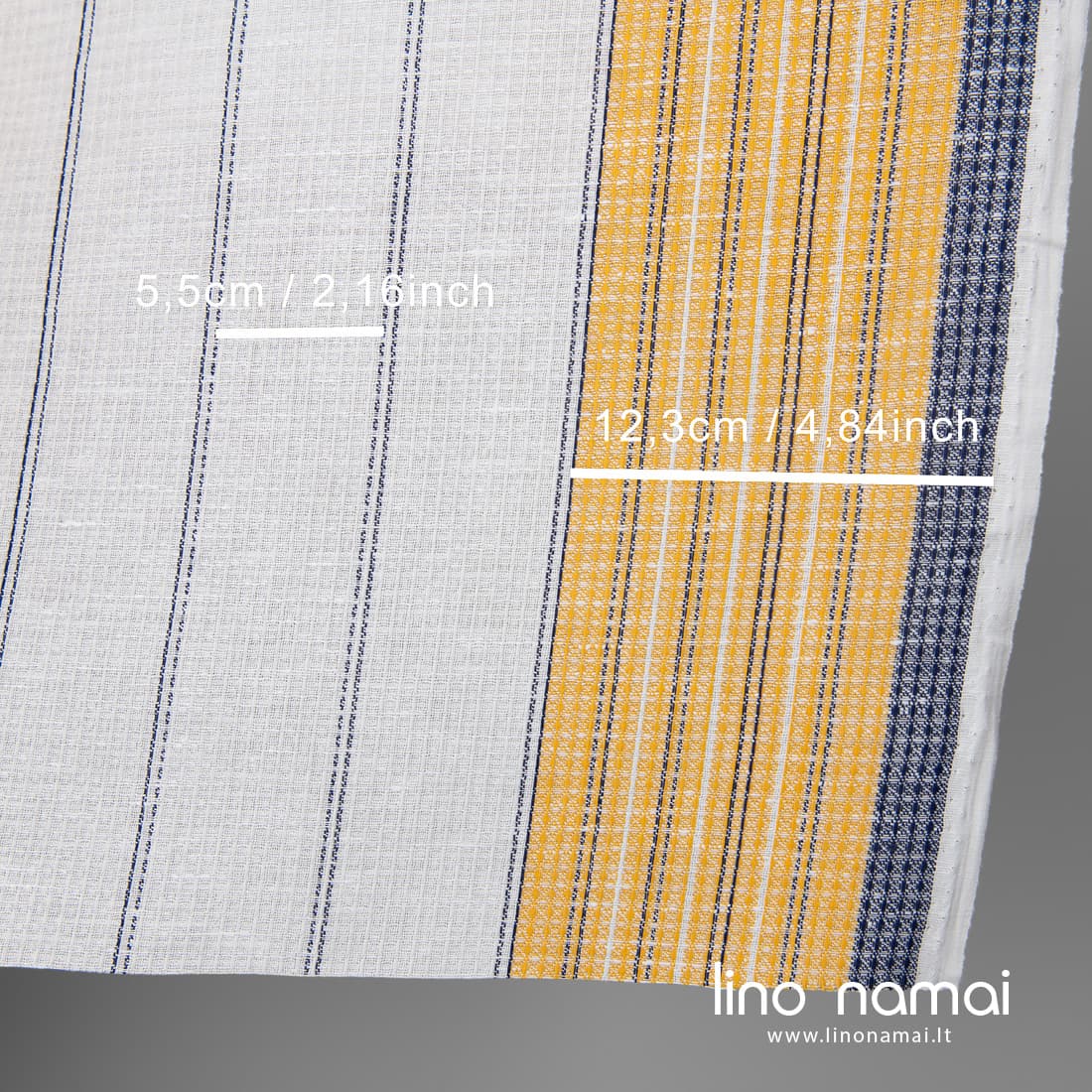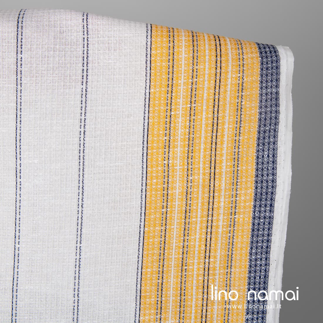 • Ryškiai baltas lino - medvilnės audinys „vaflinis“ geltonai ir tamsiai mėlynai dryžuotas