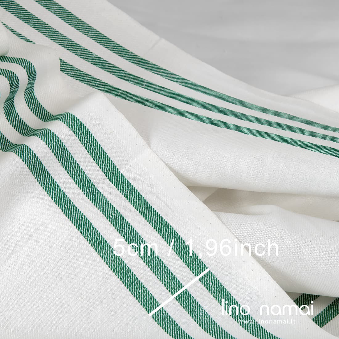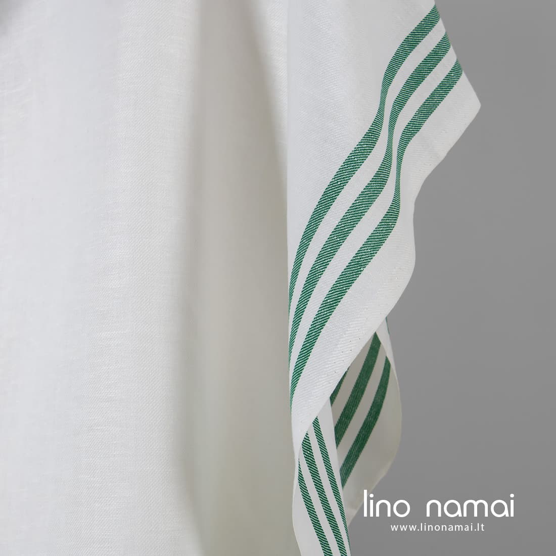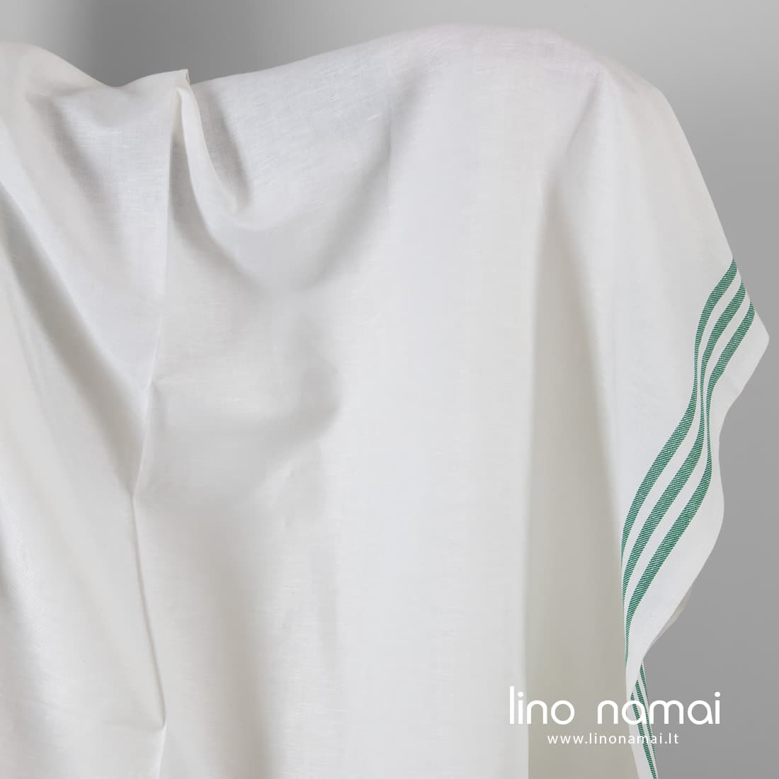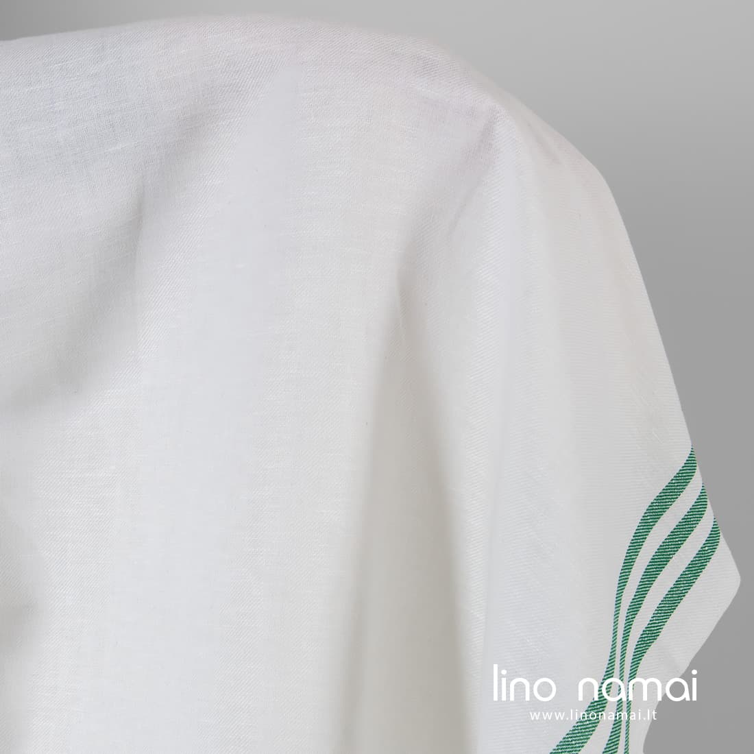 • Ryškiai baltas lino - medvilnės audinys žaliomis juostelėmis kraštuose