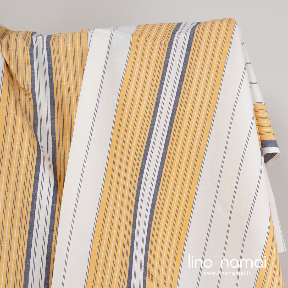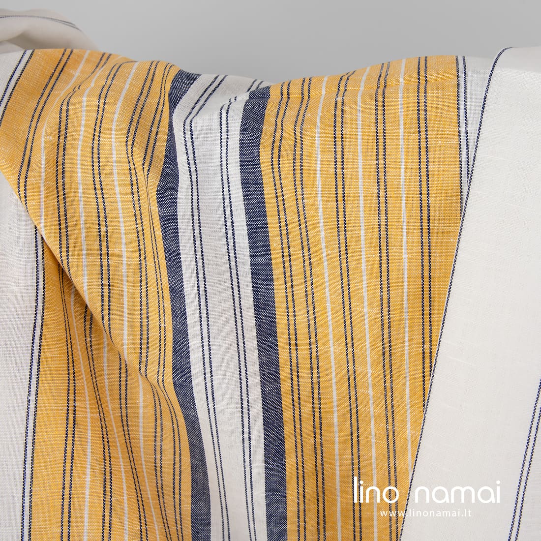 Pieno baltumo (gelsvai baltas) lino - medvilnės audinys vertikaliais įvairių pločių mėlynais ir geltonais dryžiais. Tvirtas, tankus, vidutinio storio.