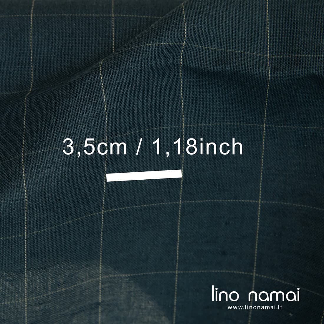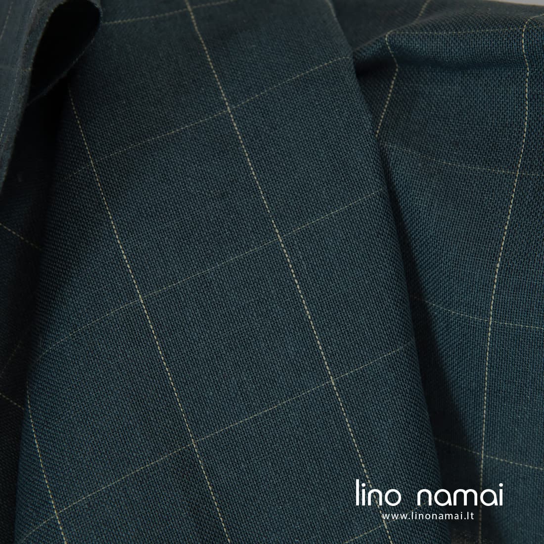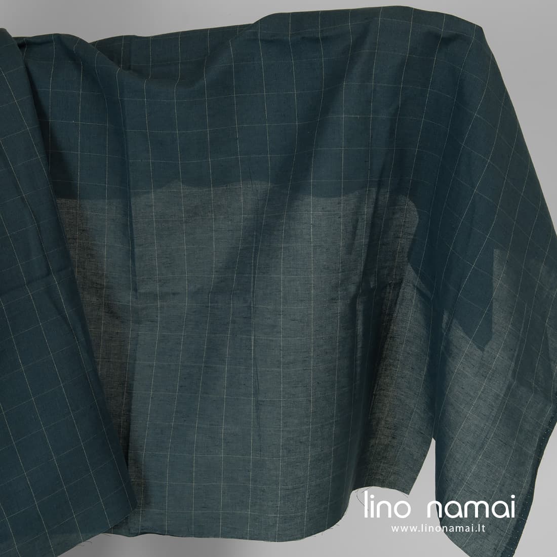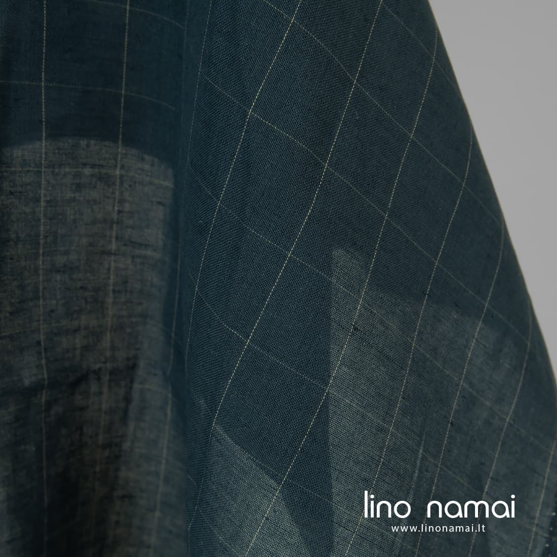 Puslininis audinys pilkai mėlynas languotas. Jame suaudėme tamsius pilkai mėlynus lino ir medvilnės verpalus, pagyvinome jį dideliais žalsvai pilkais punktyrinių linijų langeliais. Šis audinys lengvas, tankus, šiek tiek permatomas.