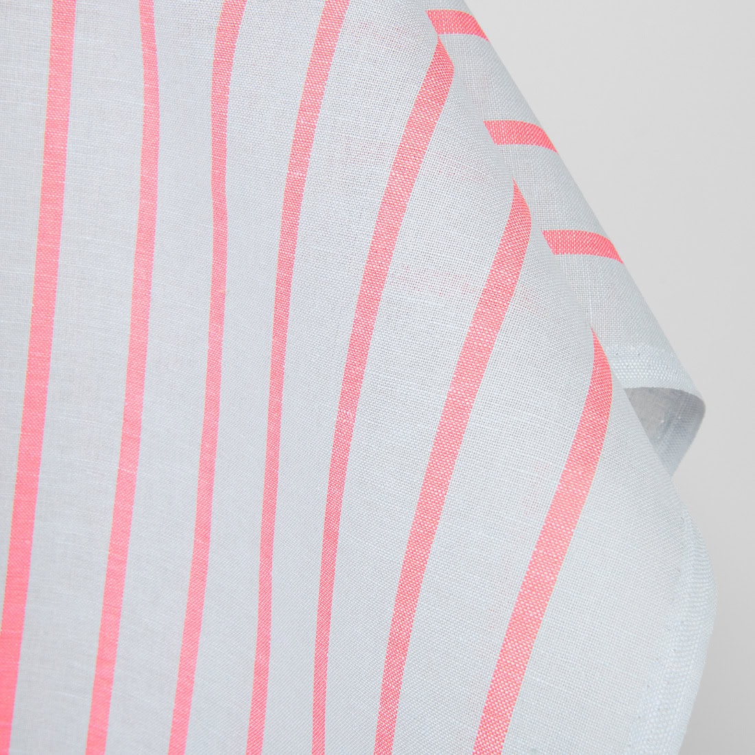 • Puslininis audinys šviesiai pilkas su ryškiai rausvais dryžiais, siūti drabužiams, stalo gaminiams