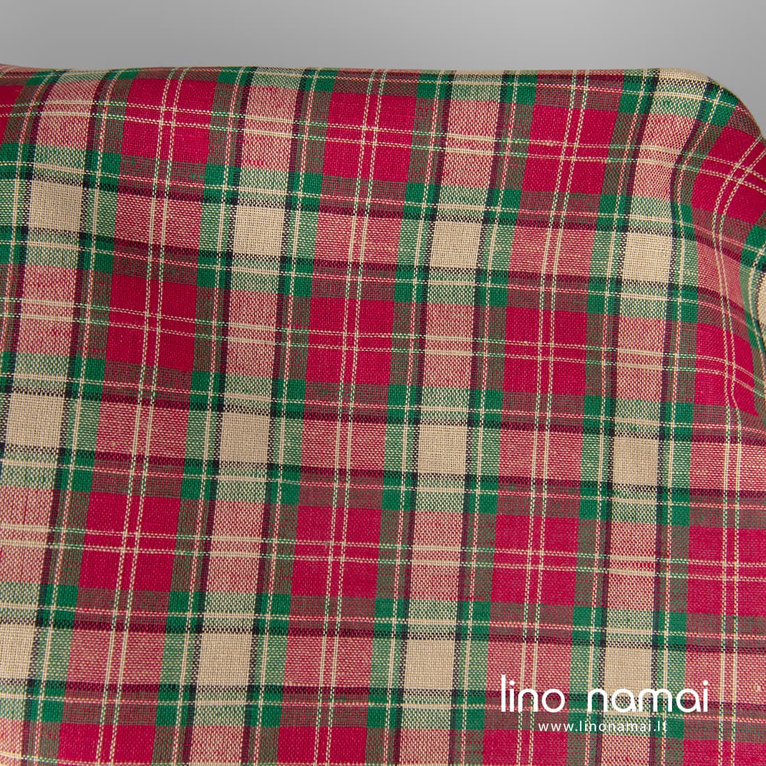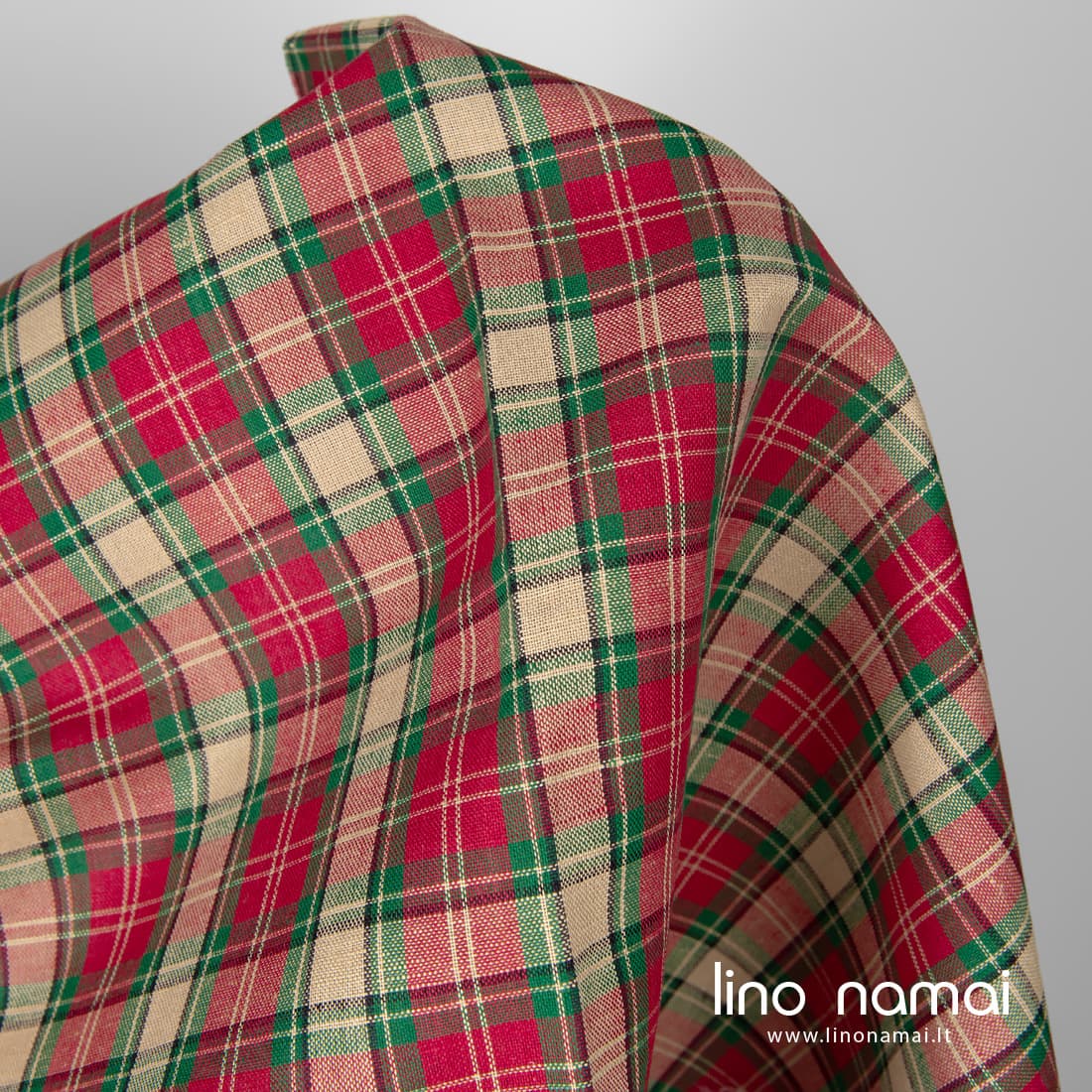 Lino-medvilnės sudėties audinys smėlio spalvos (gelsvai rusvais), raudonais, žaliais langeliais ir siauromis juodomis linijomis. Audinys tvirtas, tankus, vidutinio storio.