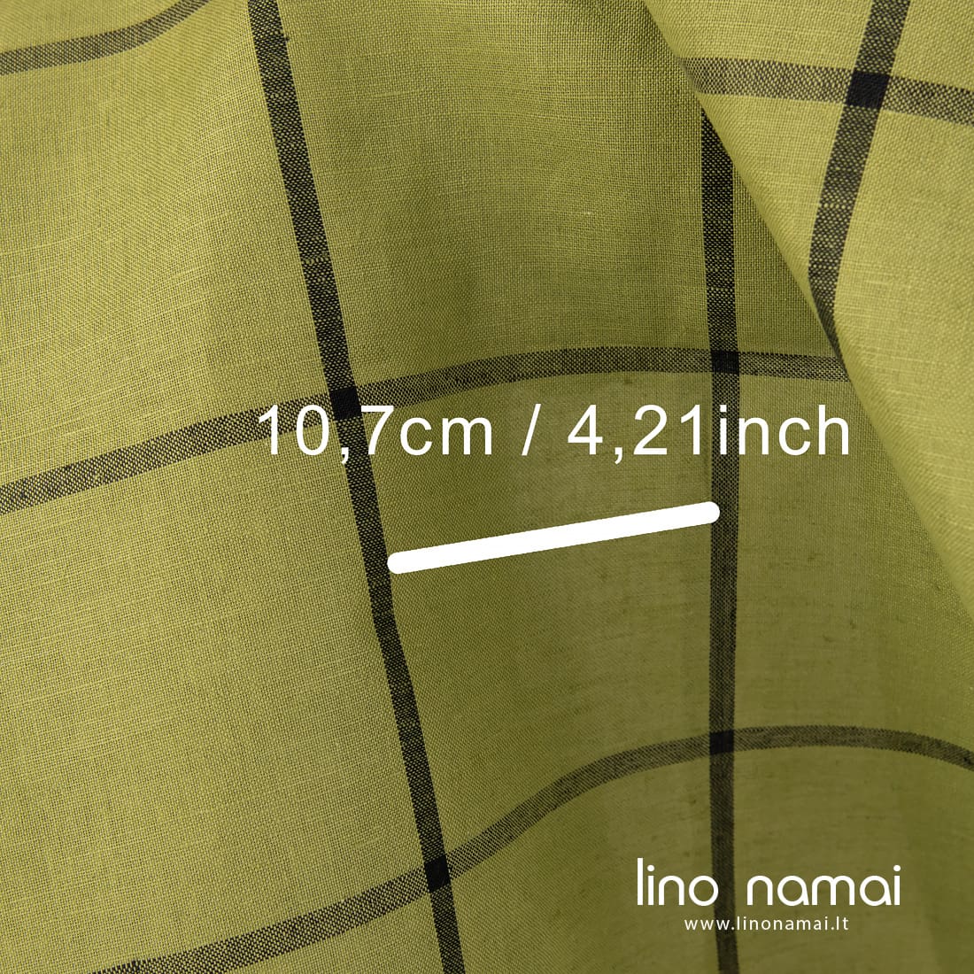 Lino - medvilnės audinys šviesiai žalias languotas. 10,7cm x 10,7cm dydžio langeliai audinyje išausti iš juodų verpalų. Šis audinys tvirtas, tankus, lengvas, tinka drabužiams ir namų tekstilei siūti.