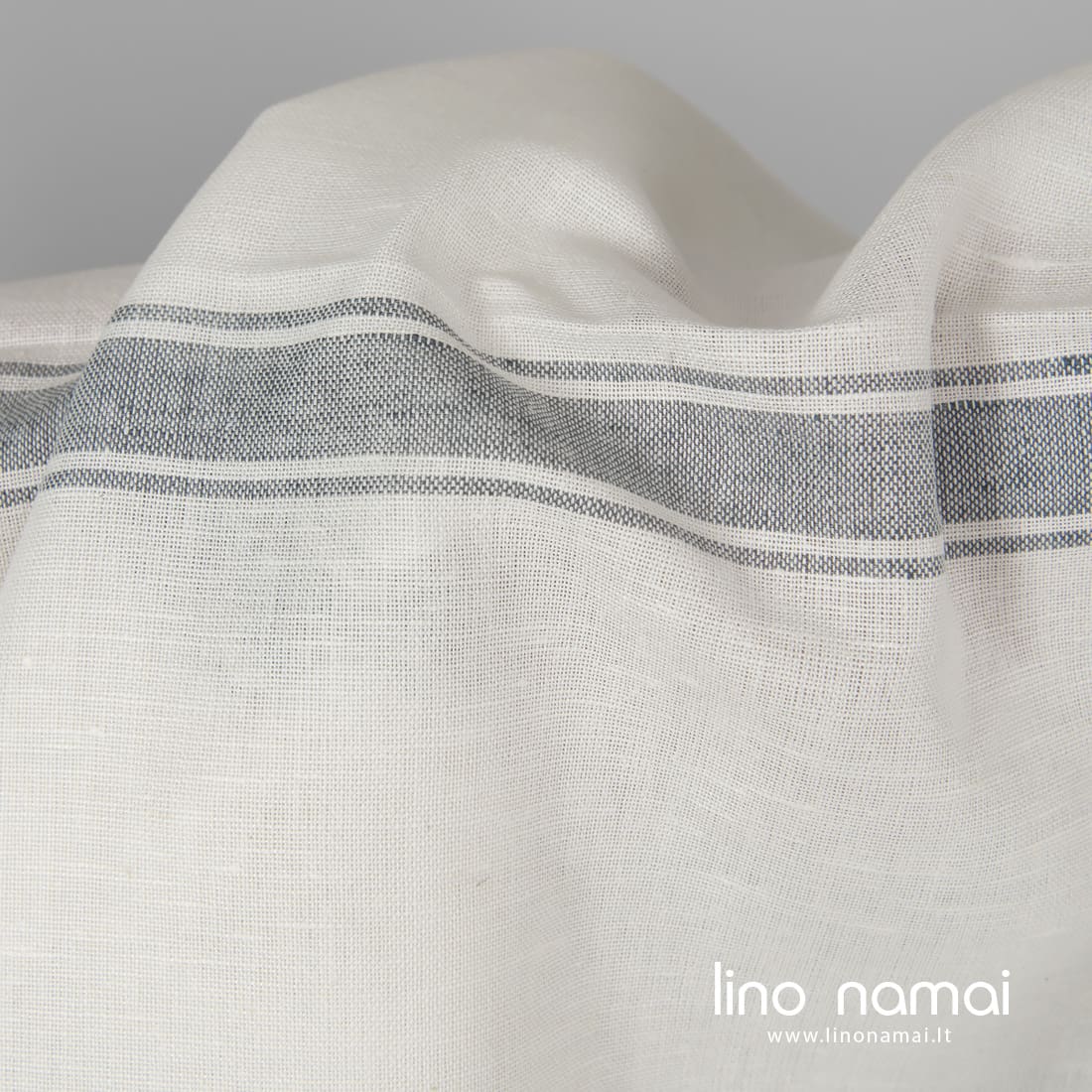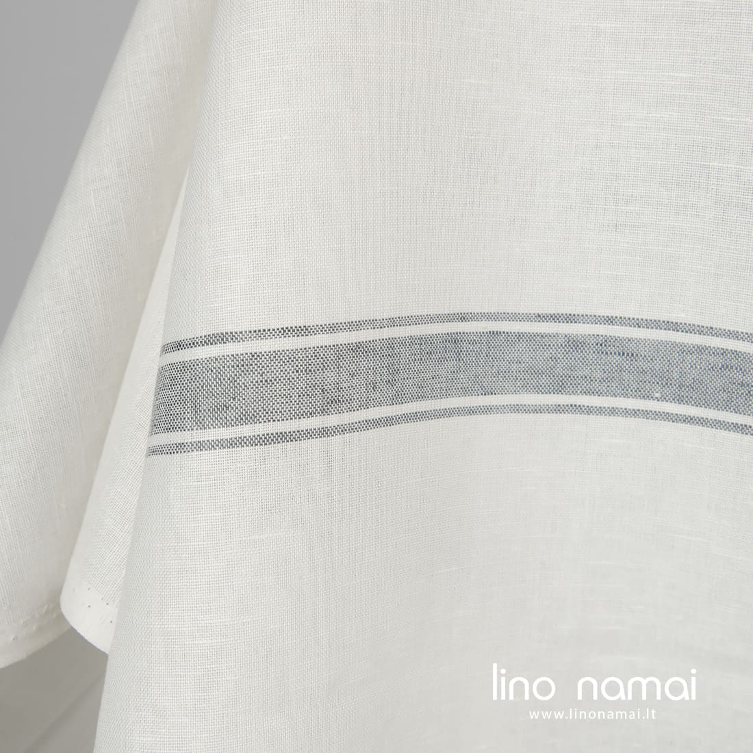 Pieno baltumo (gelsvai baltas) lino - medvilnės audinys horizontaliais pilkais dryžiais yra tvirtas, tankus, vidutinio storio. Iš jo galima siūti drabužius ir namų tekstilę.
