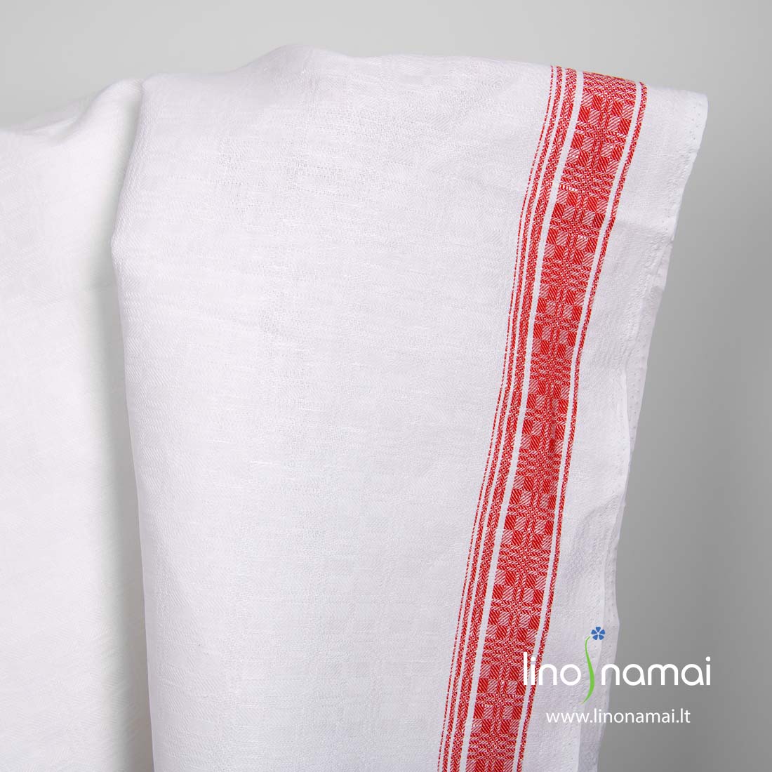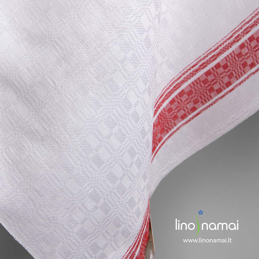 Puslininis baltas audinys raudonai raštuotomis juostomis kraštuose. Austas iš ryškiai baltų lino ir medvilnės verpalų tradiciniu langelių raštu. 115cm pločio audinys su raudonų langelių juosta viename krašte, 150cm pločio turi raudonai languotas juosteles abejose kraštinėse. Tvirtas, tankus, patvarus, vidutinio storio audinys.