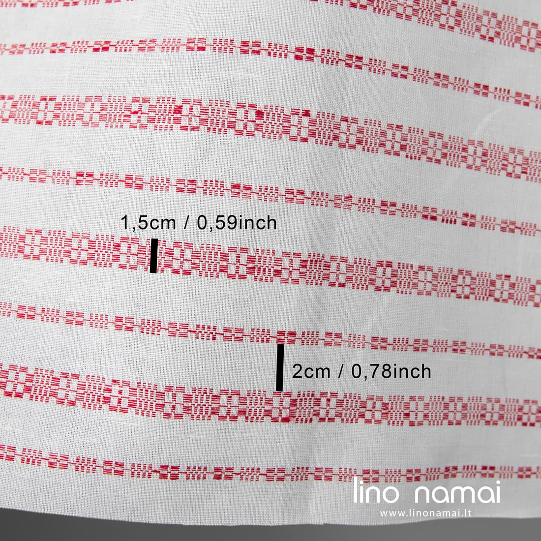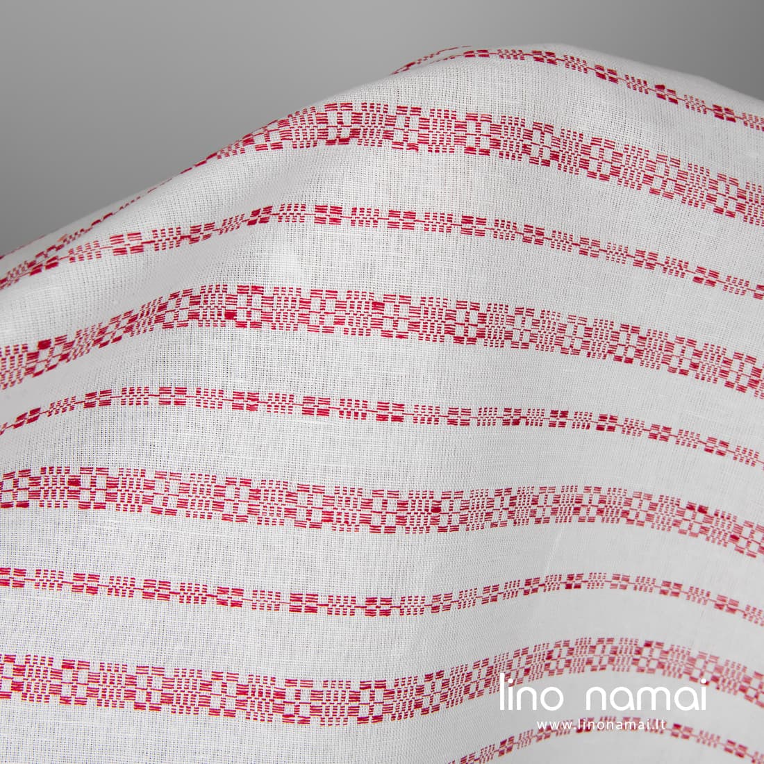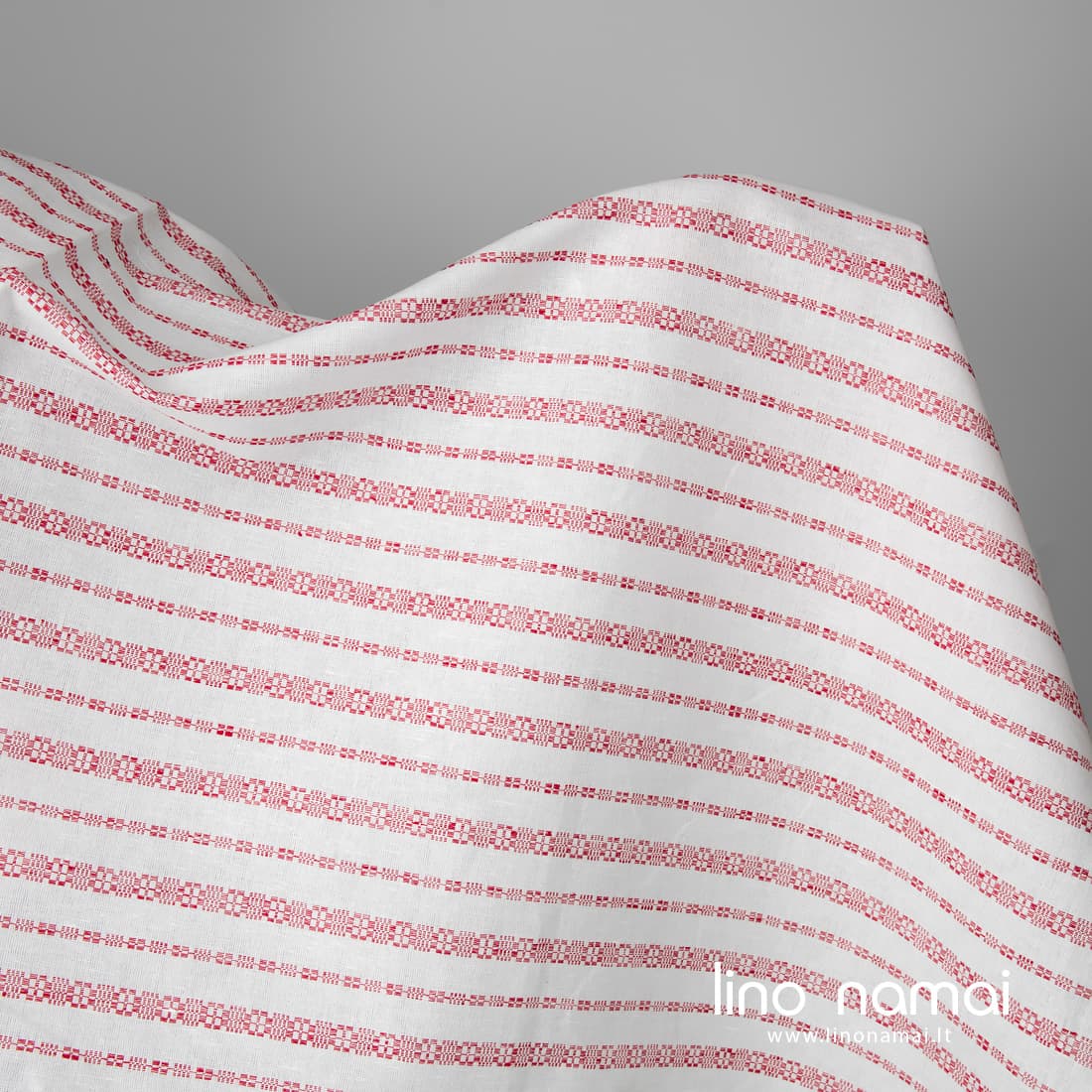 Puslininis baltas audinys raudonomis raštuotomis juostelėmis