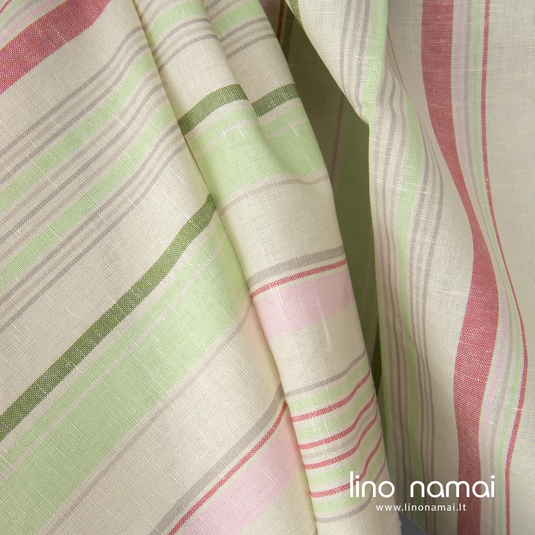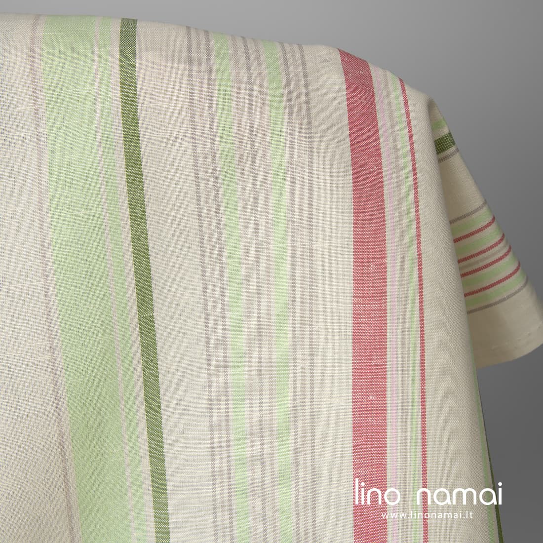 Puslininis gelsvas audinys įvairiaspalvėmis juostelėmis, kurias išaudėme vertikaliai iš rožinių, rausvų, šviesiai pilkų, žalių ir salotinės spalvos verpalų. Šis lino - medvilnės sudėties audinys yra tvirtas, tankus, patvarus, vidutinio storio.