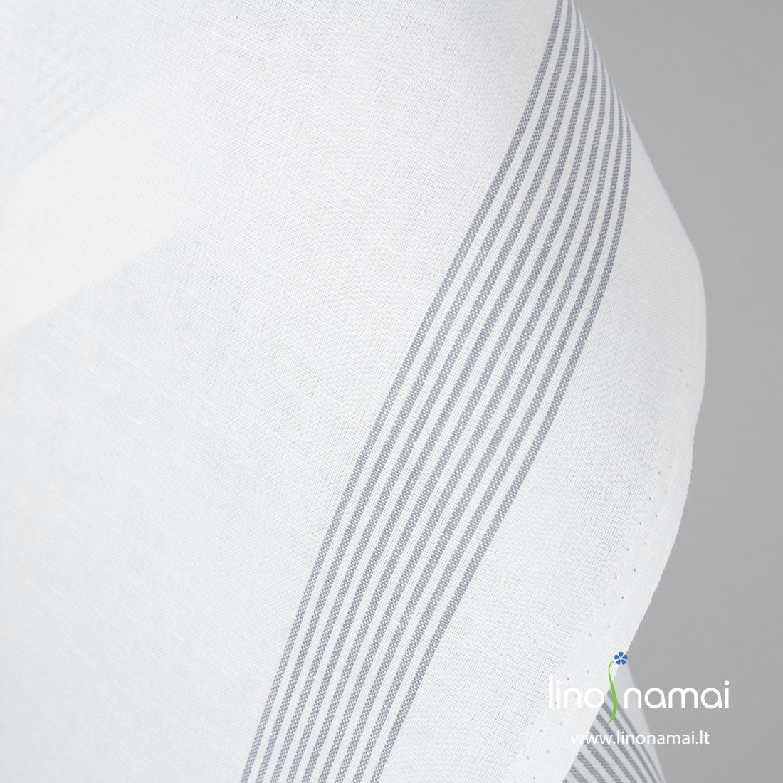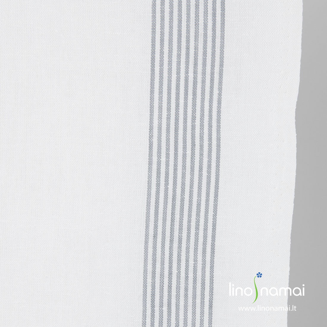 Puslininis rankšluostinis audinys pilkomis juostelėmis, išaustomis vertikaliai ryškiai baltame fone. Tvirtas, tankus, patvarus, vidutinio storio, puikiai sugeriantis drėgmę. Tinka virtuvės rankšluostukams siūti.