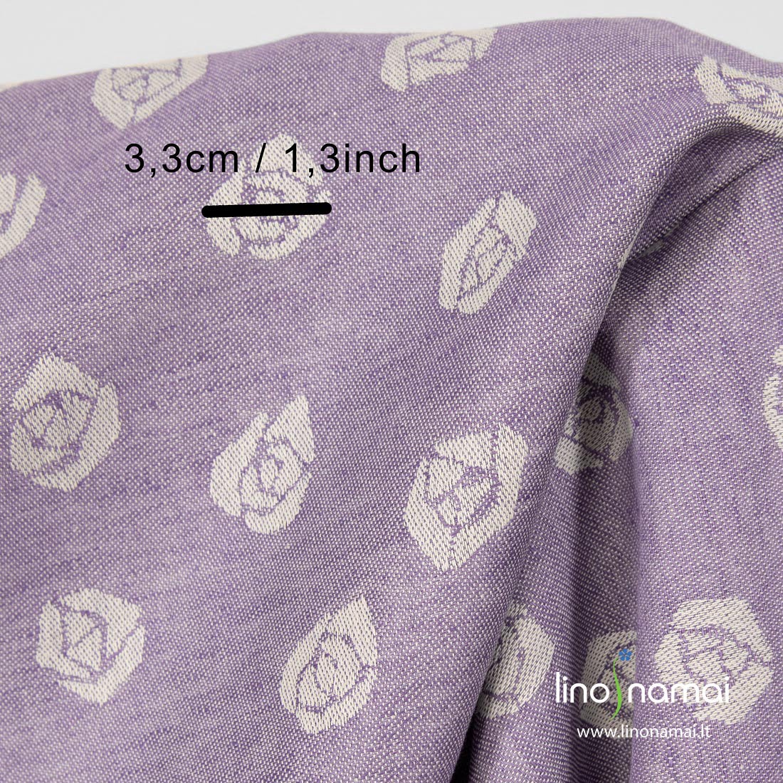 Puslininis violetinis audinys su rožytėmis. Šis lino-medvilnės sudėties audinys yra žakardinis, dvipusis: viena pusė šviesiai violetinė su įaustomis gelsvomis (kreminės spalvos) rožėmis, kitoje pusėje vyraujanti spalva gelsva, įaustos alyvų spalvos rožės. Siuvant drabužius, stalo, virtuvės gaminius, dekoratyvius pagalvėlių užvalkalus galima naudoti abi puses. Audinys tvirtas, tankus, vidutinio storio.