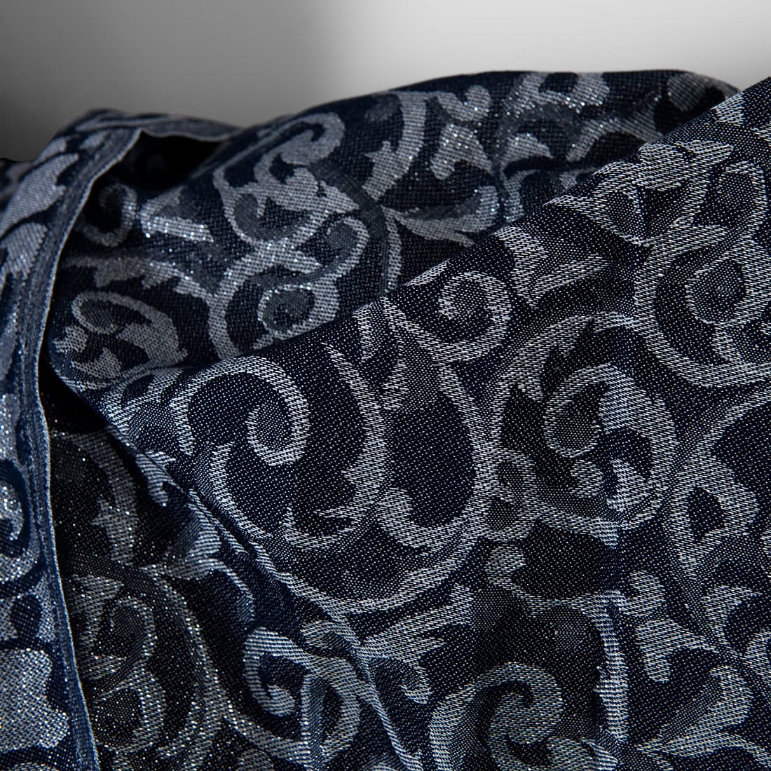 • Puslininis žakardinis tamsiai melynas blizgantis audinys, tinka drabužiams, aksesuarams, namų tekstilei siūti