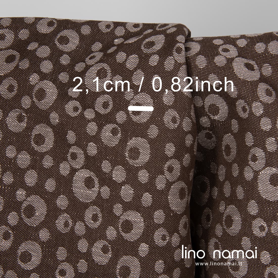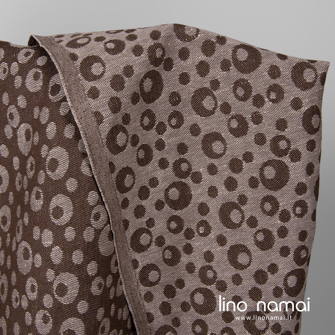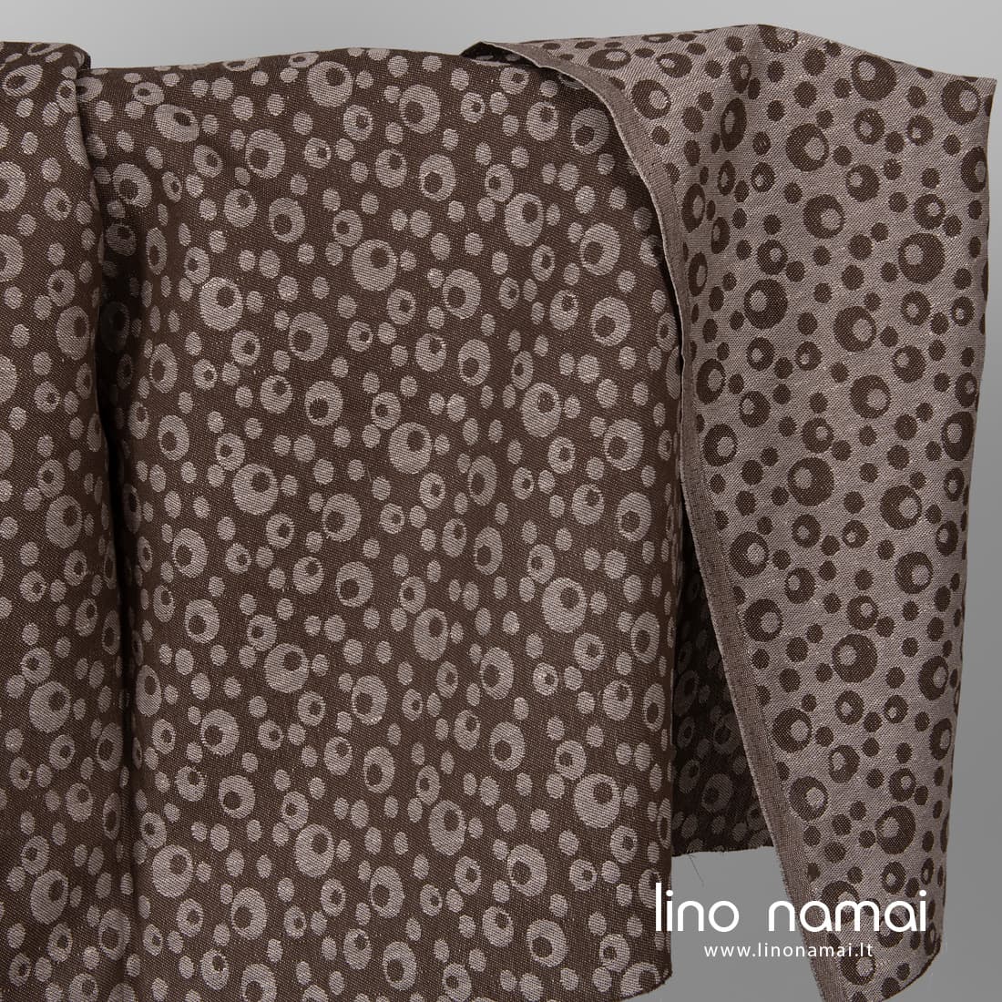 Žakardinis dvipusis lino - medvilnės audinys austas burbuliukų raštu iš tamsiai rudų ir šviesiai rudų verpalų. Siuviniams galite naudoti abi audinio puses. Šis audinys tvirtas, tankus, vidutinio storio ir svorio.