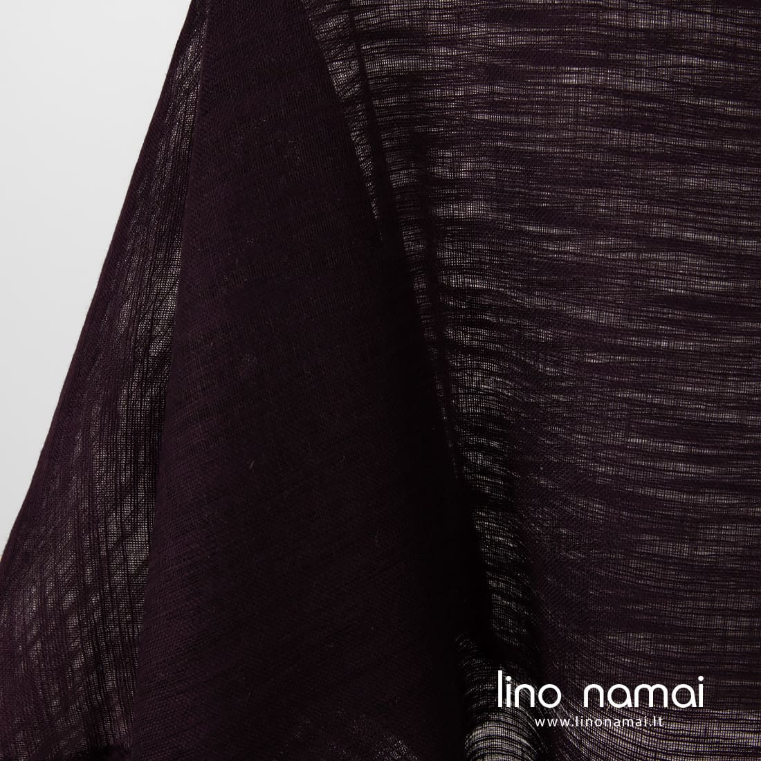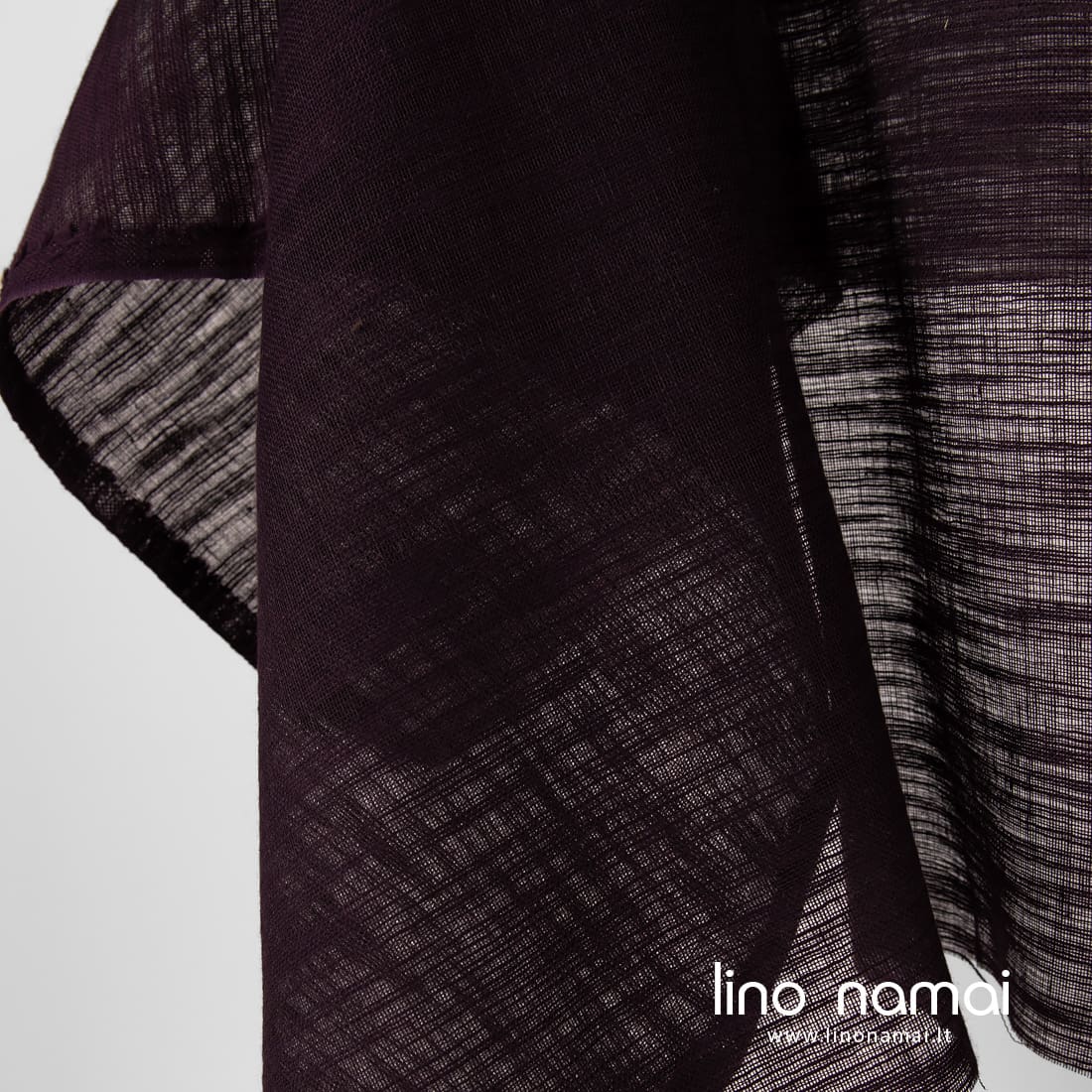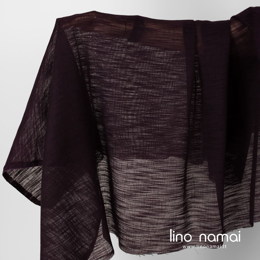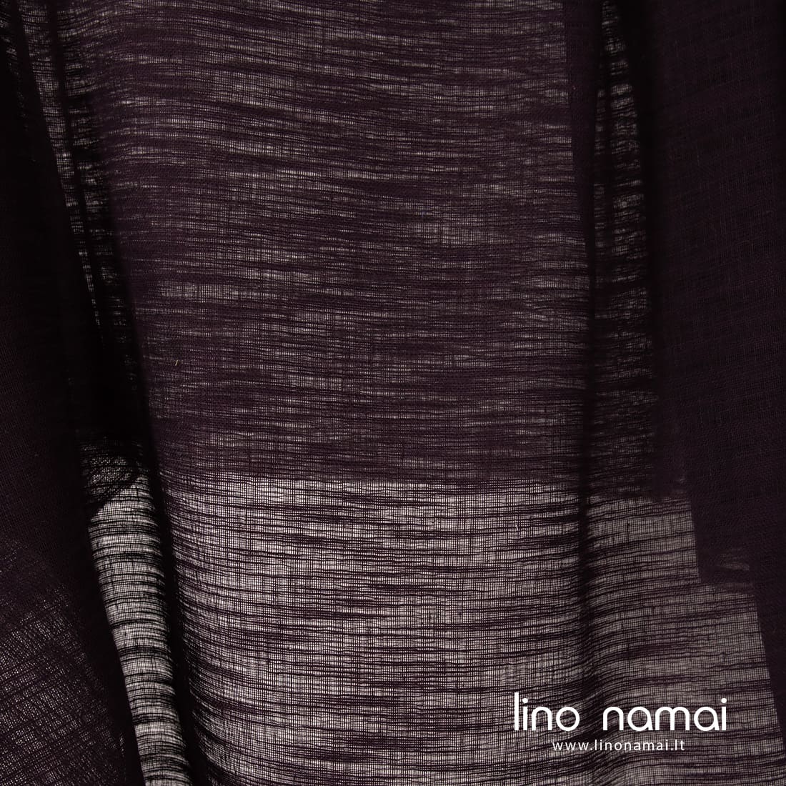 Tamsiai violetinis (baklažano spalvos) lino - medvilnės audinys su horizontaliais atsitiktiniais dryžiukais iš verpalų su specialiais sustorėjimais. Retas, permatomas, lengvas. Tinka užuolaidoms, šalikams siūti.