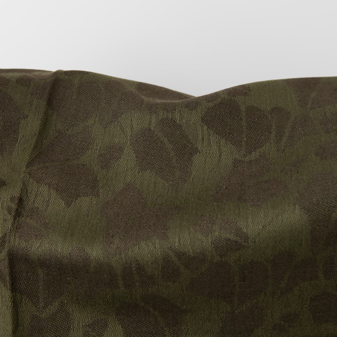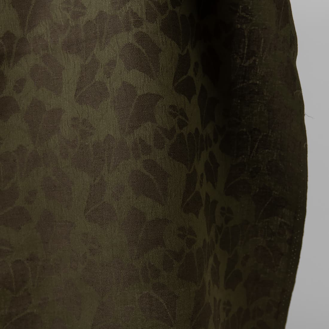 Tamsiai žalias lino - medvilnės sudėties audinys su įaustais tamsesniais, žalsvai rudais lapeliais. Tvirtas, tankus žakardinis audinys.