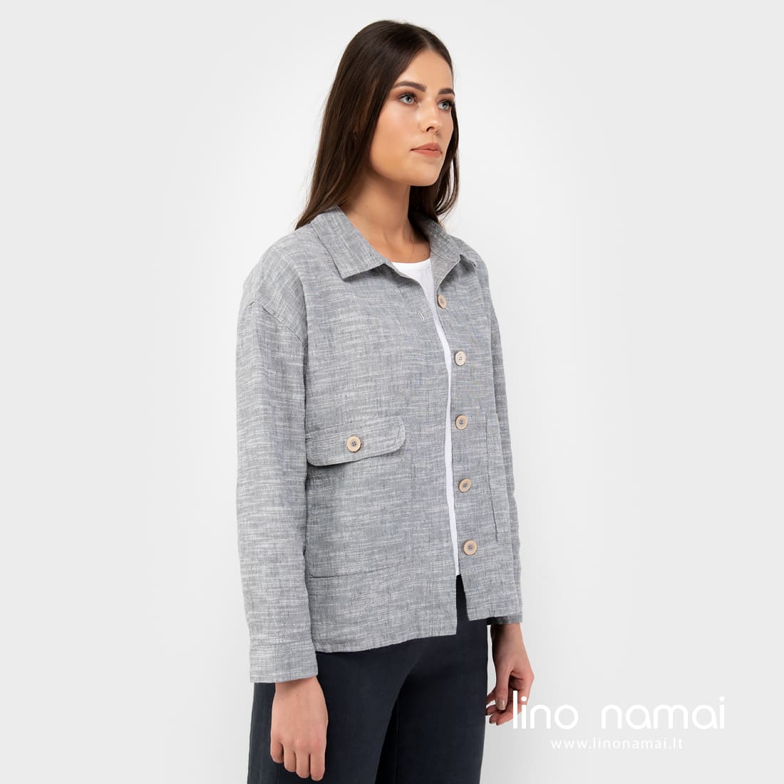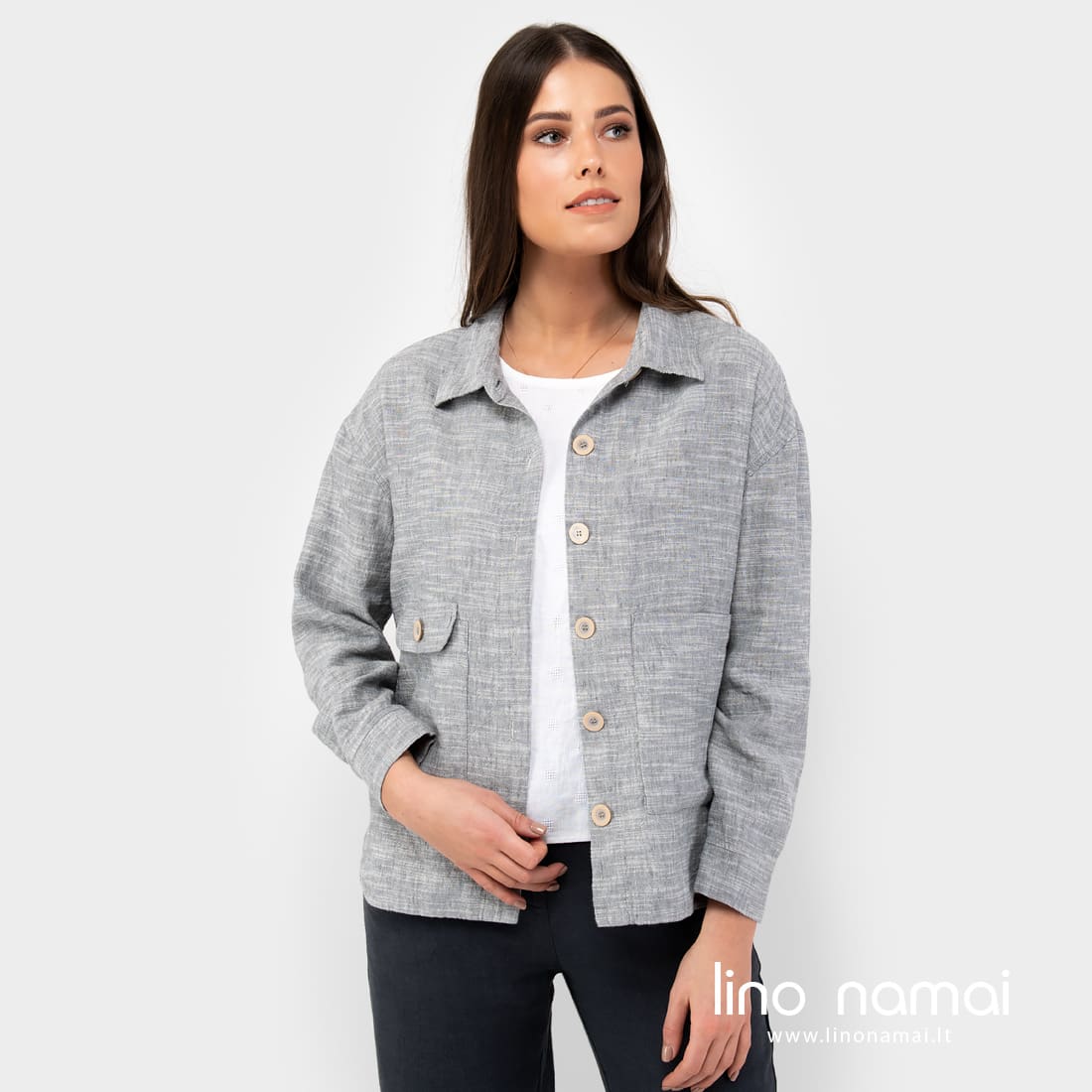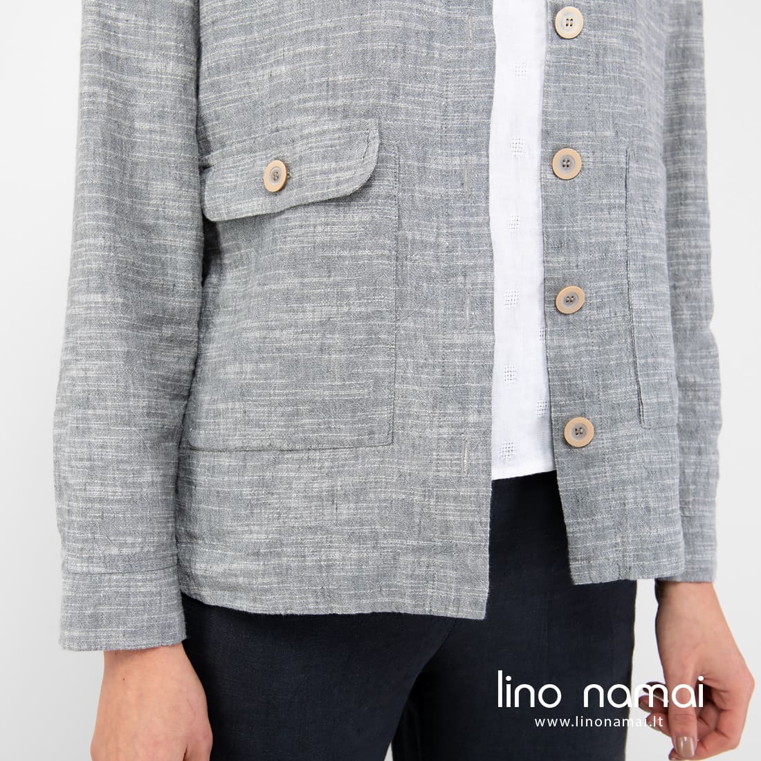 Pilkas marškinių kirpimo švarkelis, pasiūtas iš lino - medvilnės sudėties audinio. Gaminio audinys melanžinis: jame suaudėme pilkus ir pieno baltumo verpalus. Atsitiktiniai horizontalūs balti dryžiukai iš verpalų su specialiais sustorėjimais suteikia švarkeliui nepakartojamo margumo, gyvumo, traukia žvilgsnį. Patogus, ramių spalvų laisvalaikio stiliaus drabužis vėsesnei vasaros dienai.