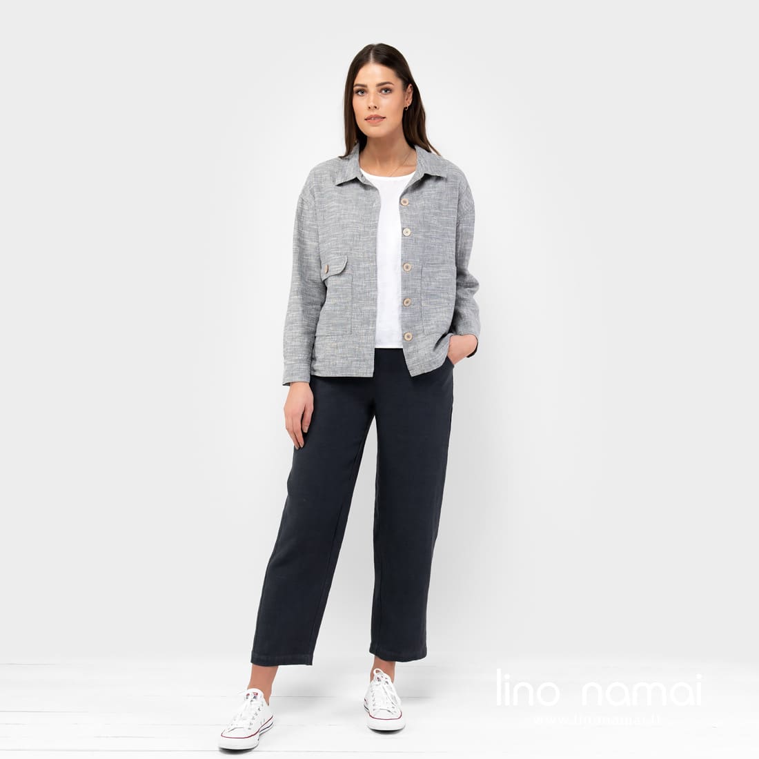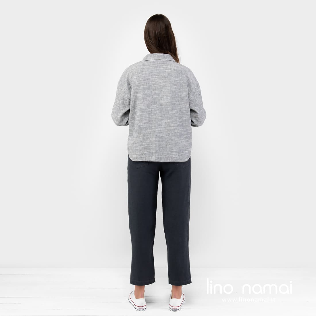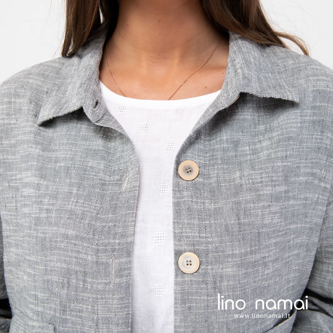 Pilkas marškinių kirpimo švarkelis, pasiūtas iš lino - medvilnės sudėties audinio. Gaminio audinys melanžinis: jame suaudėme pilkus ir pieno baltumo verpalus. Atsitiktiniai horizontalūs balti dryžiukai iš verpalų su specialiais sustorėjimais suteikia švarkeliui nepakartojamo margumo, gyvumo, traukia žvilgsnį. Patogus, ramių spalvų laisvalaikio stiliaus drabužis vėsesnei vasaros dienai.