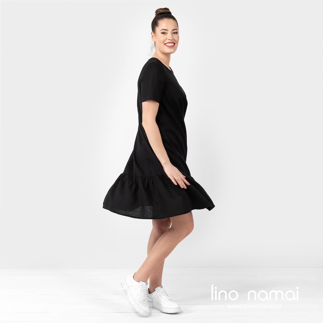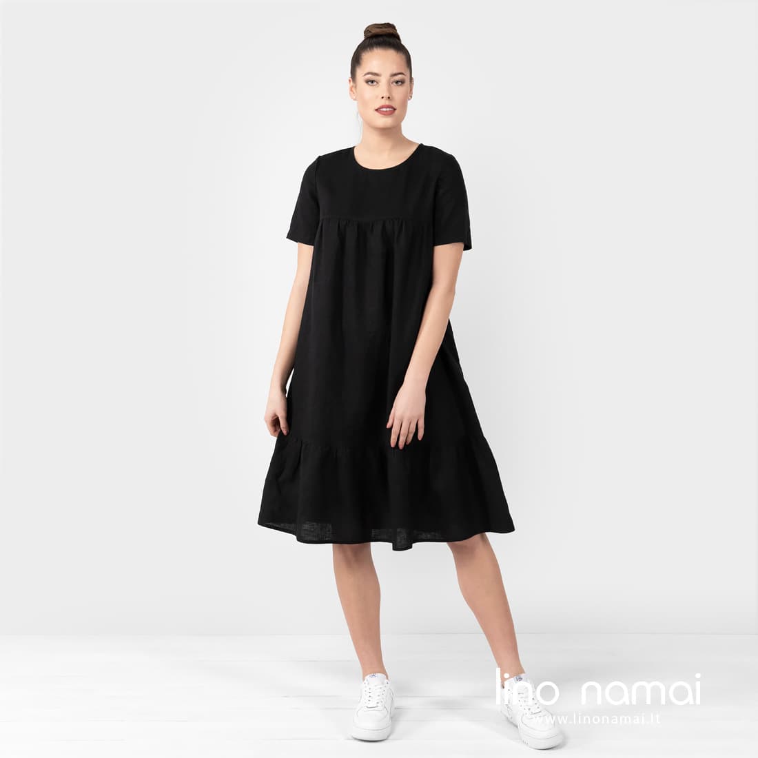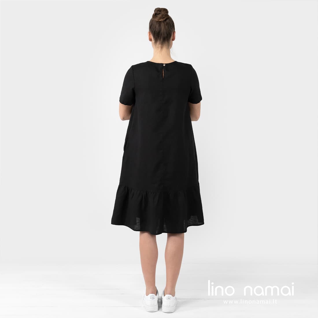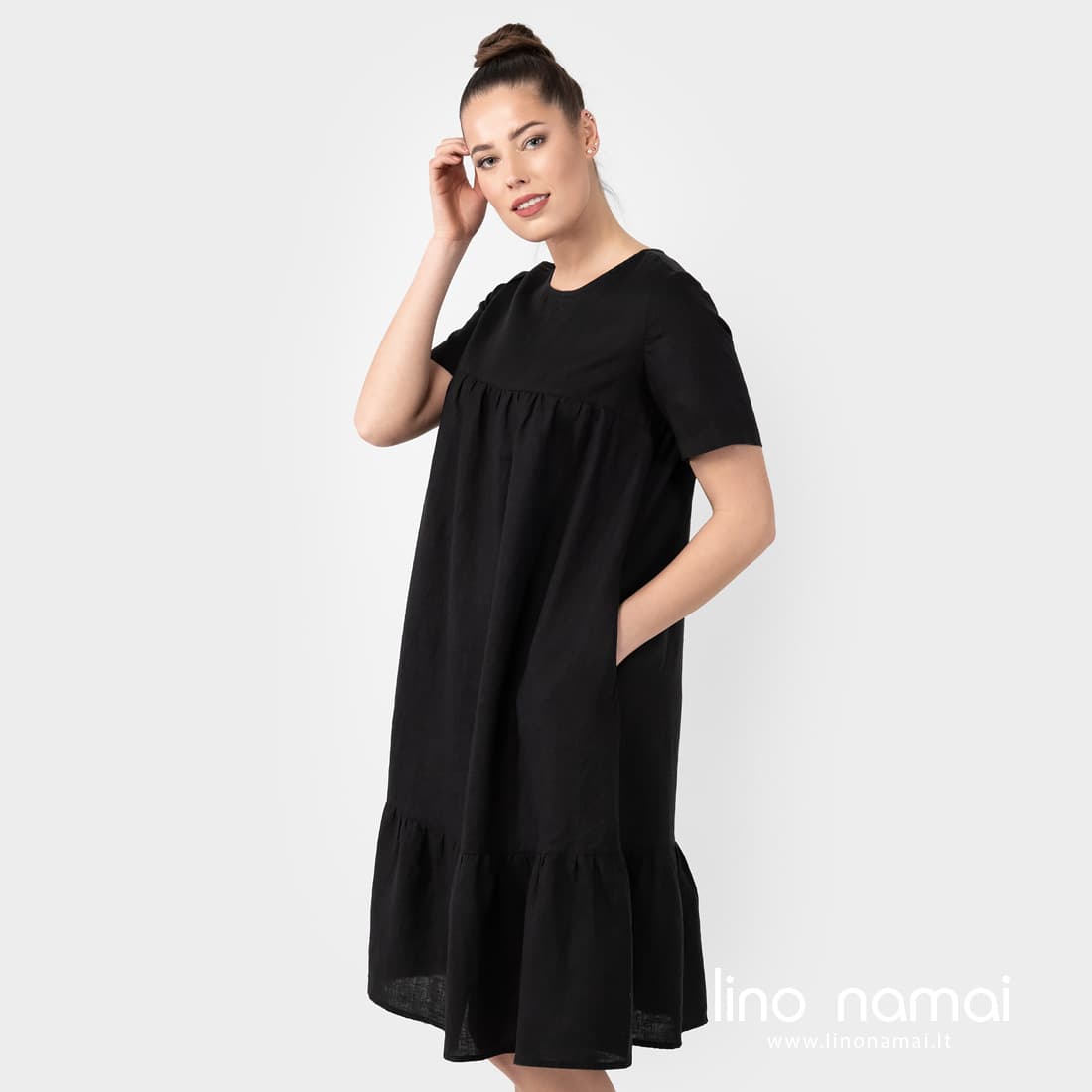 • Lininė juoda suknelė su paraukimu apačioje, su kišenėmis