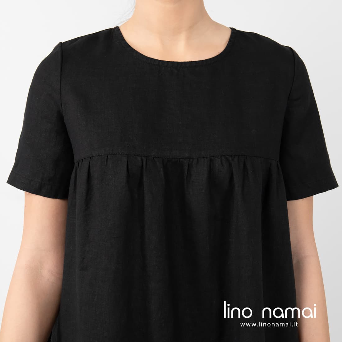 • Lininė juoda suknelė su paraukimu ties krūtine
