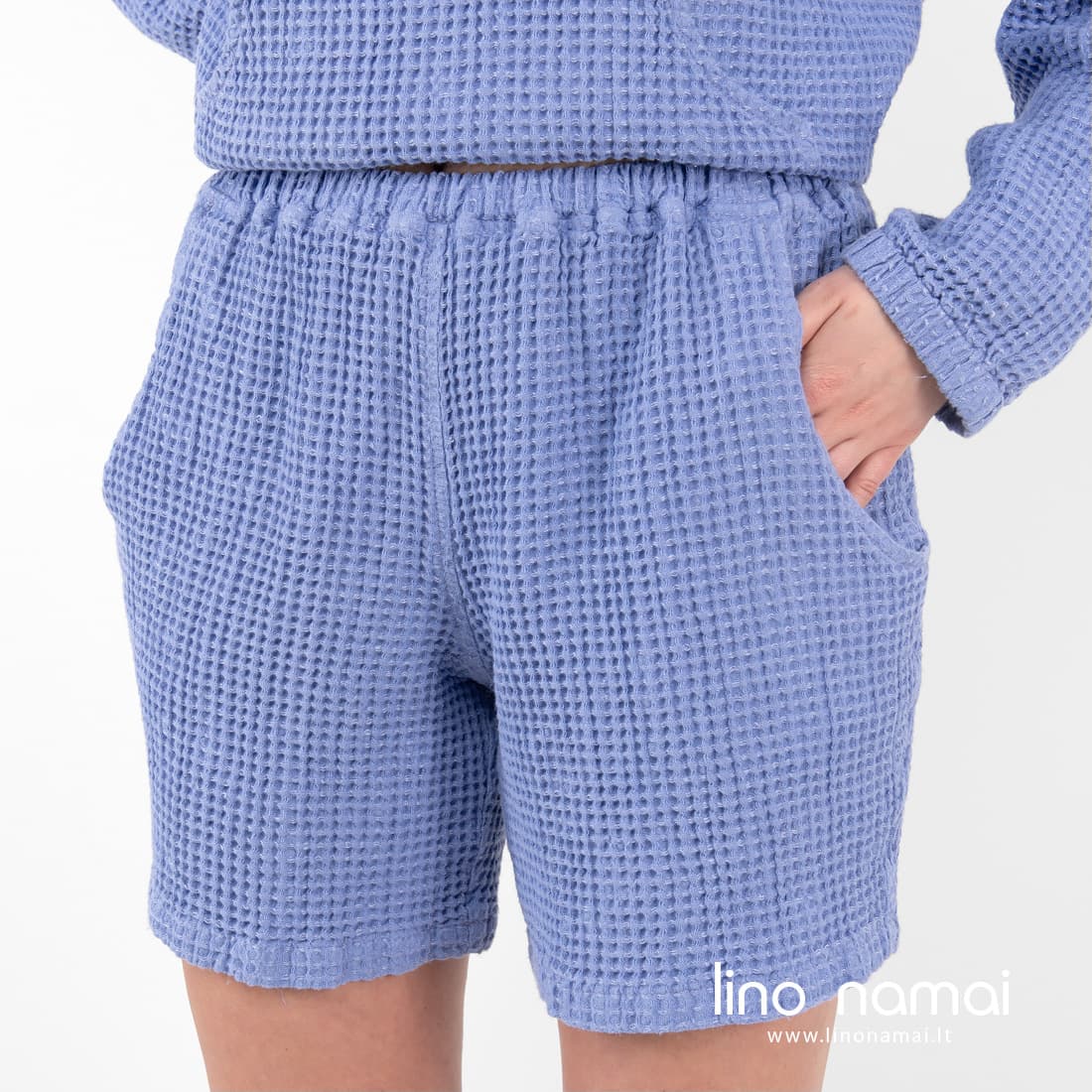• Lino-medvilnės moteriški šortai „vafliniais“ langeliais, melsvos spalvos, su kišenėmis