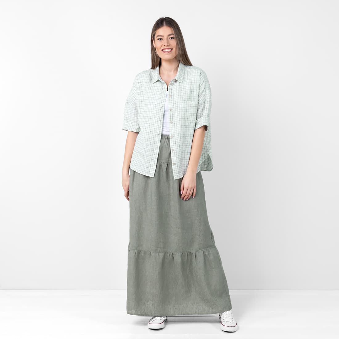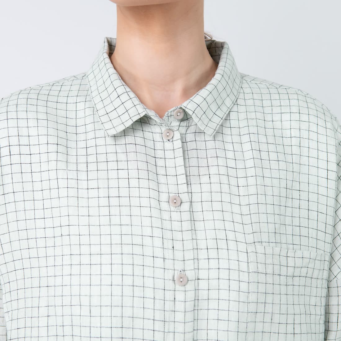 • Lininė žalsva languota palaidinė su sagų užsegimu per visą ilgį