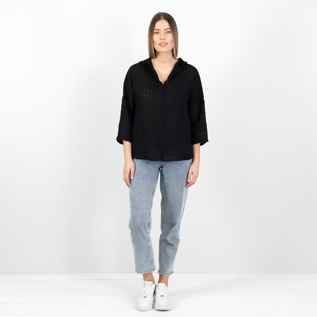 • Lininė juoda palaidinė tankaus ir retesnio pynimo langeliais