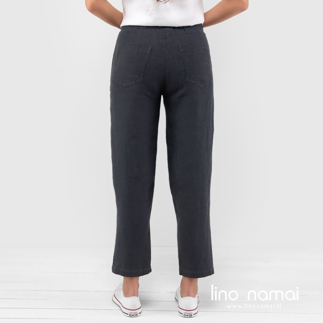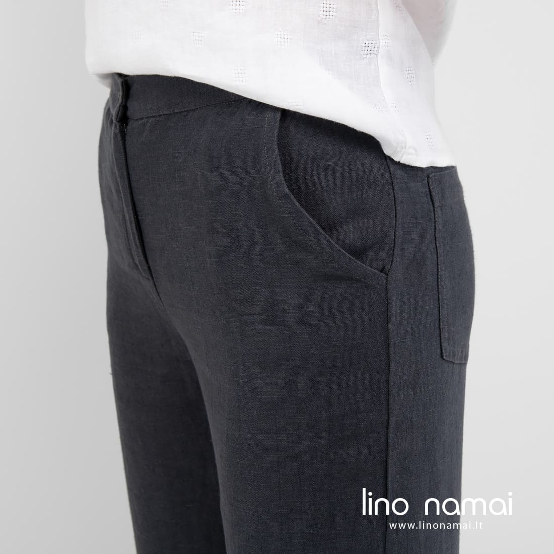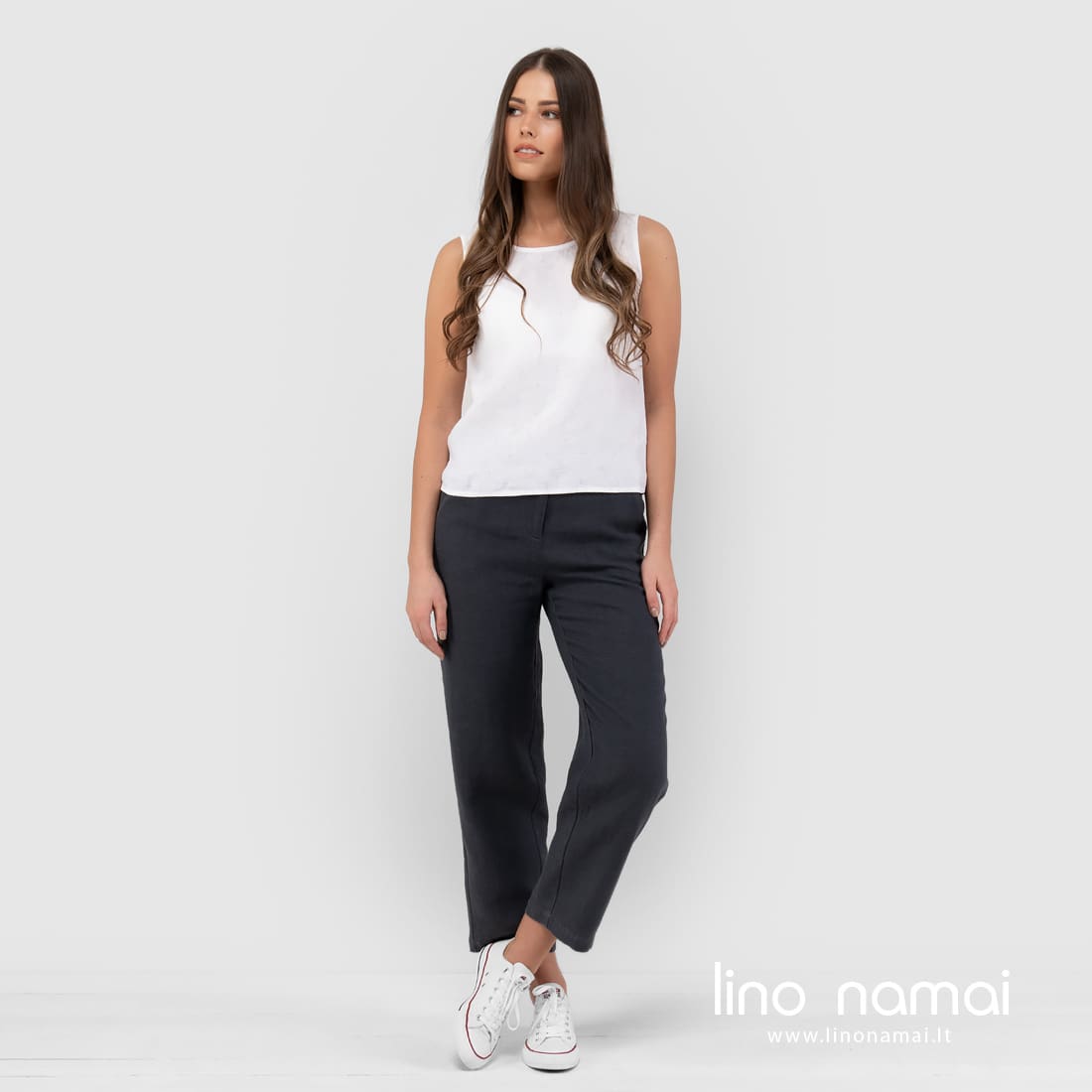 BIRMA kelnės / kiulotai tamsiai pilki iš 100% lino audinio. Platus, laisvas kirpimas nevaržys Jūsų judesių, natūralus audinys leis odai kvėpuoti. Tamsios spalvos drabužius galima nešioti ir vasarą, jei jie pagaminti iš lino ir yra derinami su šviesesniais ar ryškiai margintais įvaizdžio elementais. Mūsų parduotuvėje rasite įvairiaspalvių palaidinių. Įsigykite kartu su šiomis kelnėmis!