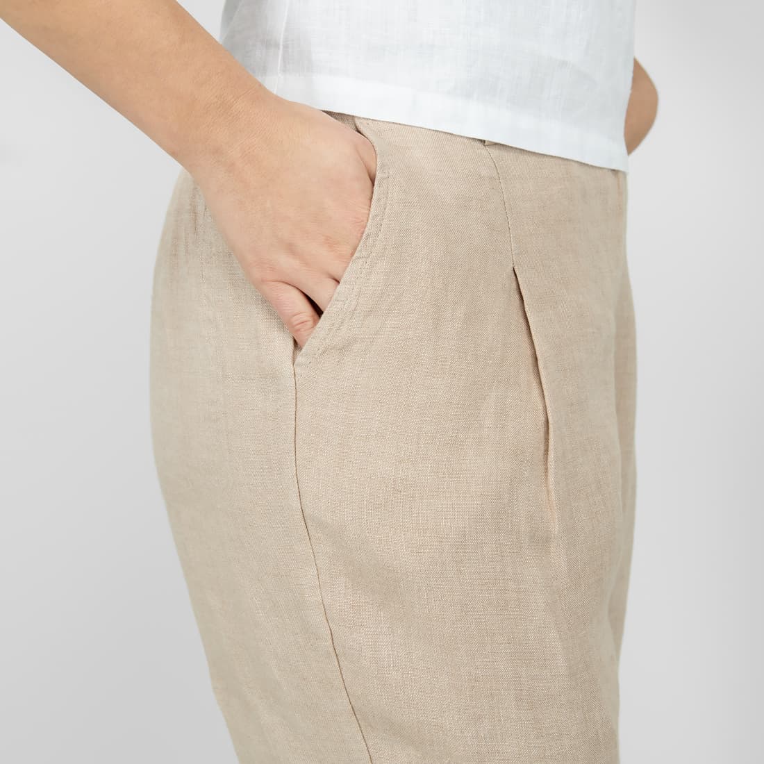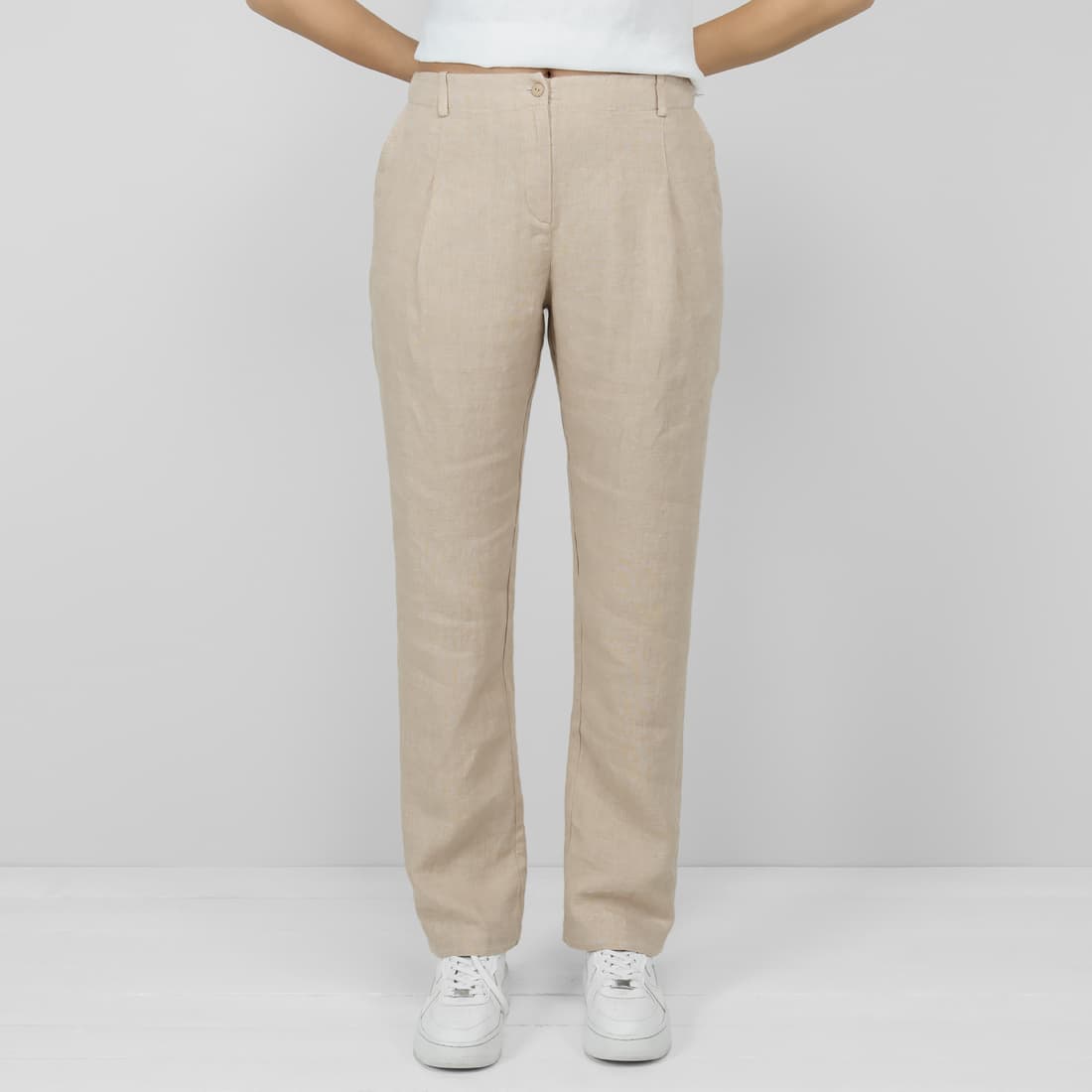 • Lininės rusvos kelnės su kišenėmis, klostelėmis priekyje