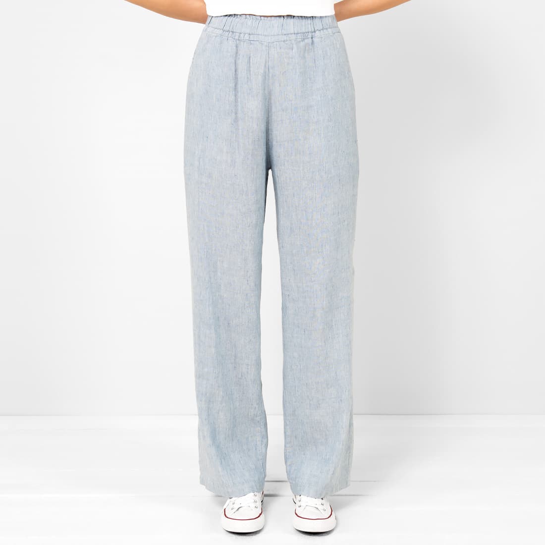• KENDA lino-viskozės melsvos kelnės su guma juosmenyje