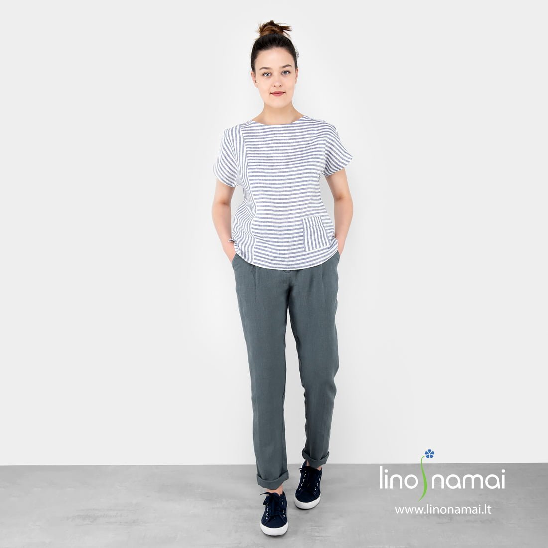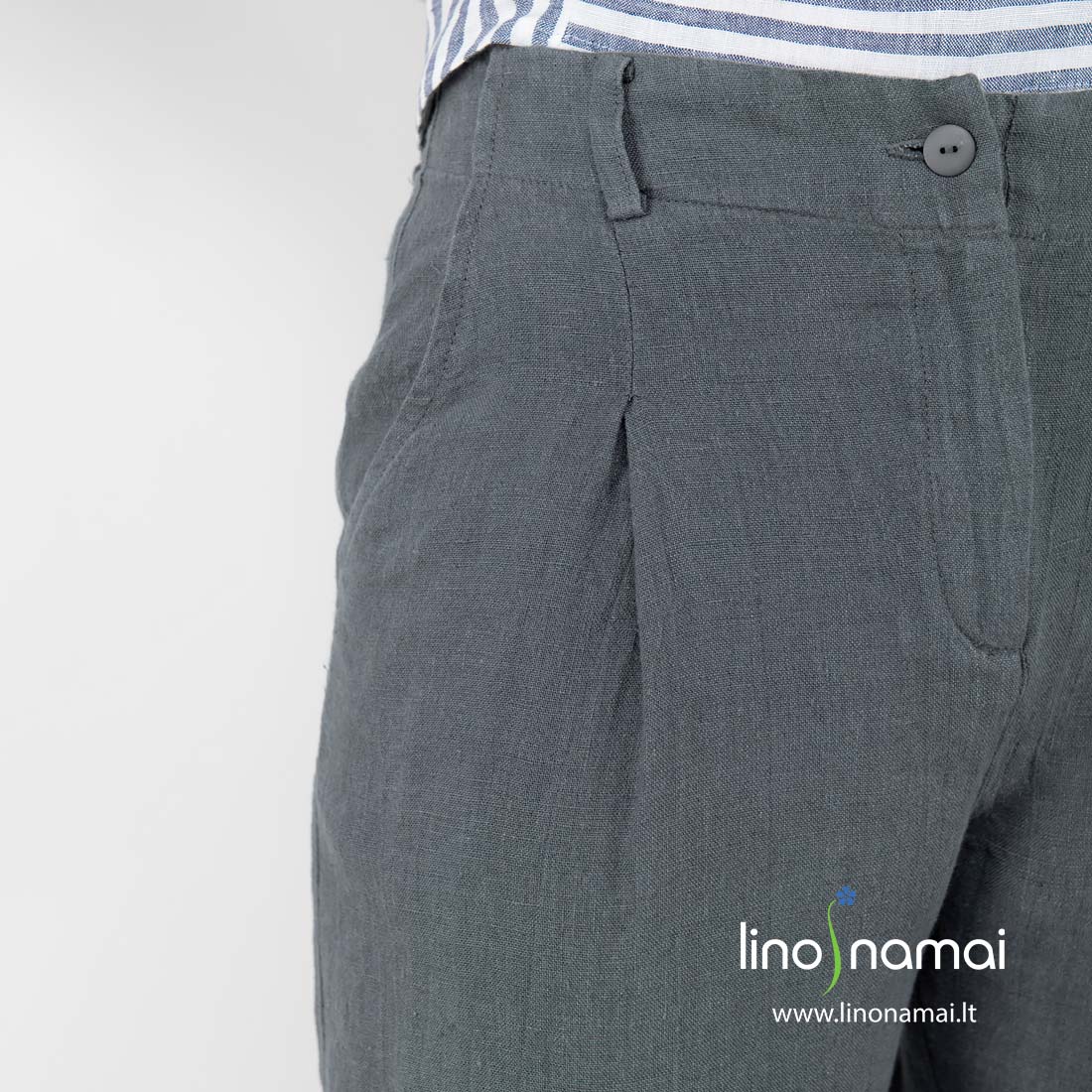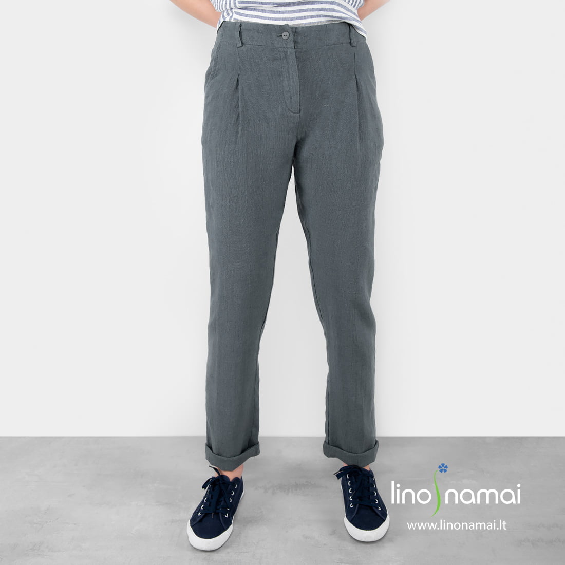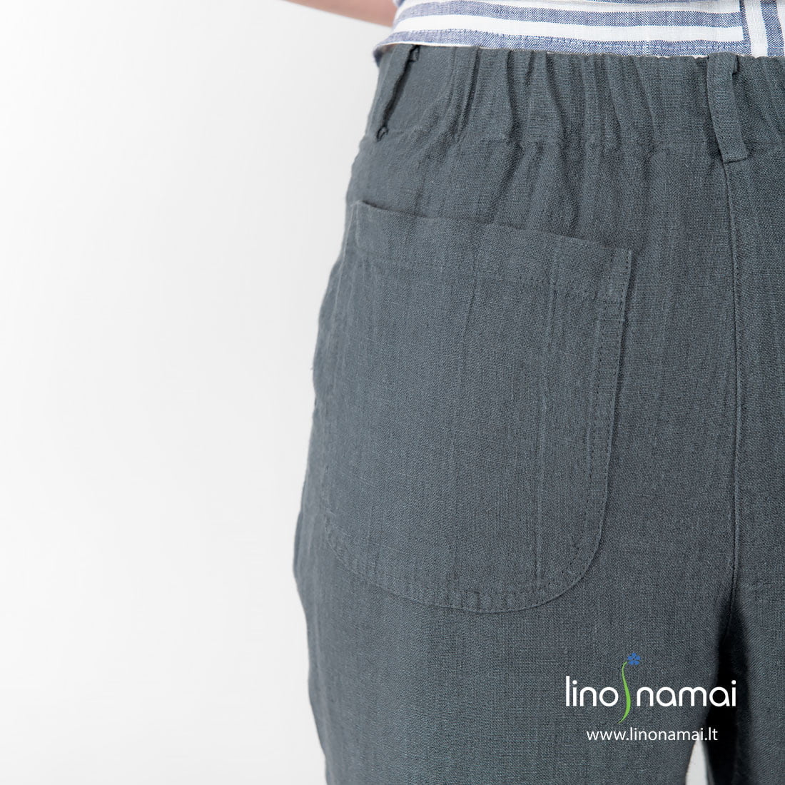 Lininės tamsiai pilkos kelnės su vos juntamu melsvu atspalviu. Vasarą nedėvite suknelių ir sijonų? Ne bėda! Specialiai Jums pasiuvome šias linines kelnes. Dėvėkite, mėgaukitės lino švelnumu ir teikiama gaiva. Atrodykite nerūpestingai, natūraliai, stilingai.