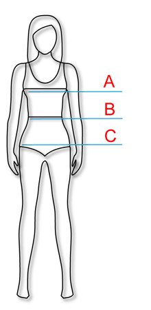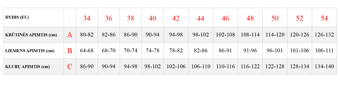 Dydžių lentelėje nurodyti kūno (ne gaminio!) išmatavimai. Norėdami nustatyti Jums tinkantį dydį, pamatuokite save. Jums reikės matavimo metro arba paprastos juostelės, siūlo ir liniuotės / ruletės. Matuokite save vilkėdami apatinius drabužius. Visada įsitikinkite, kad matavimo metras / juostelė uždėti tiesia linija.