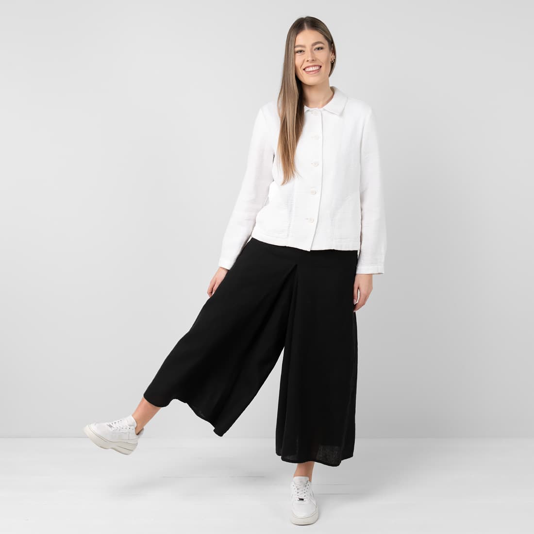 • Lininės juodos sijonkelnės MYKA ir baltas raštuotas švarkelis LIMA