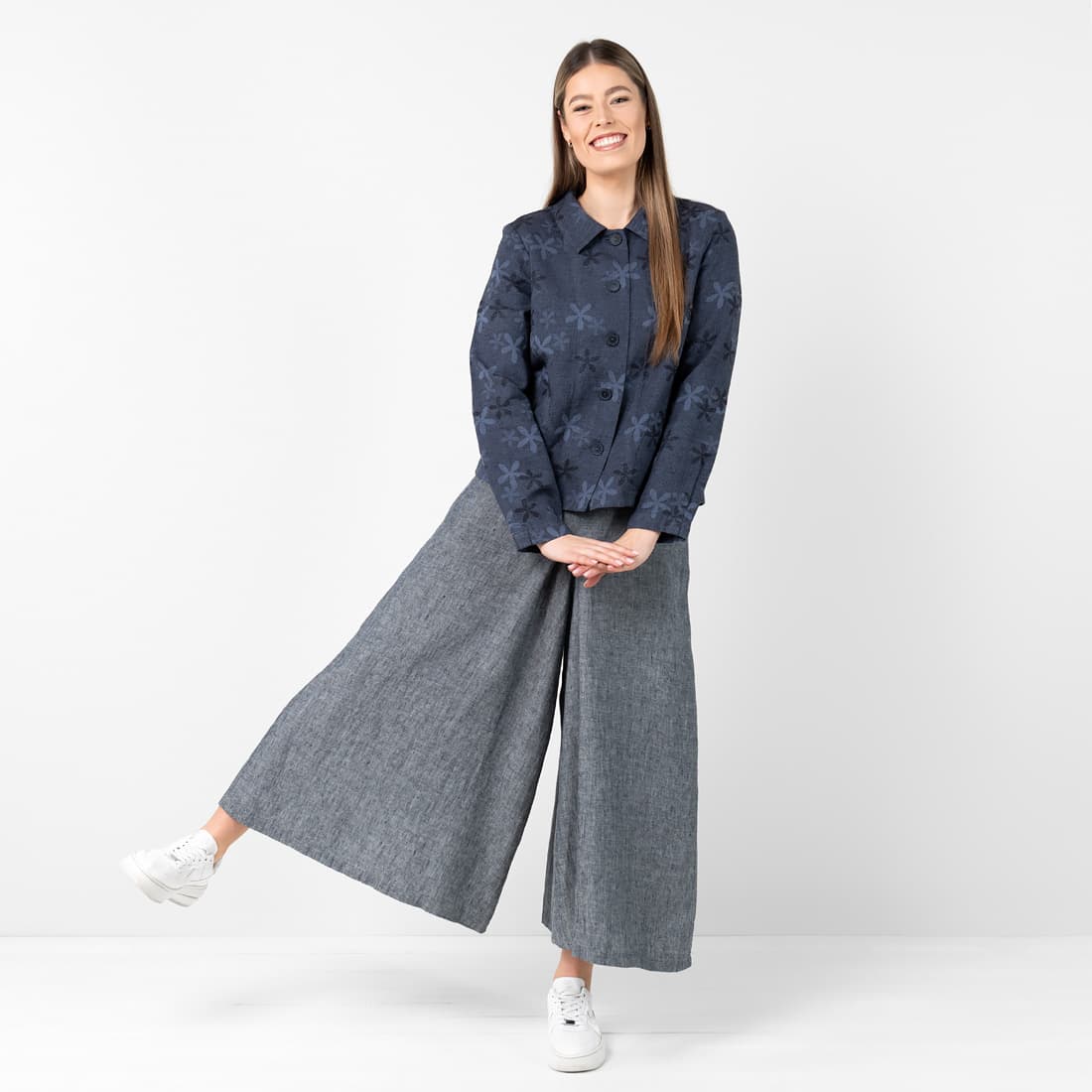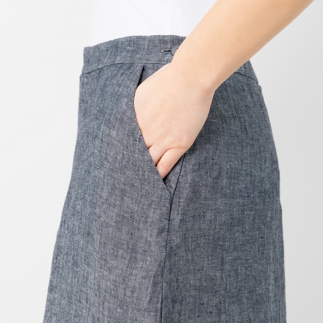 • Lininės mėlynos sijonkelnės užsegamos užtrauktuku ir saga šone, su guma nugaroje juosmenyje