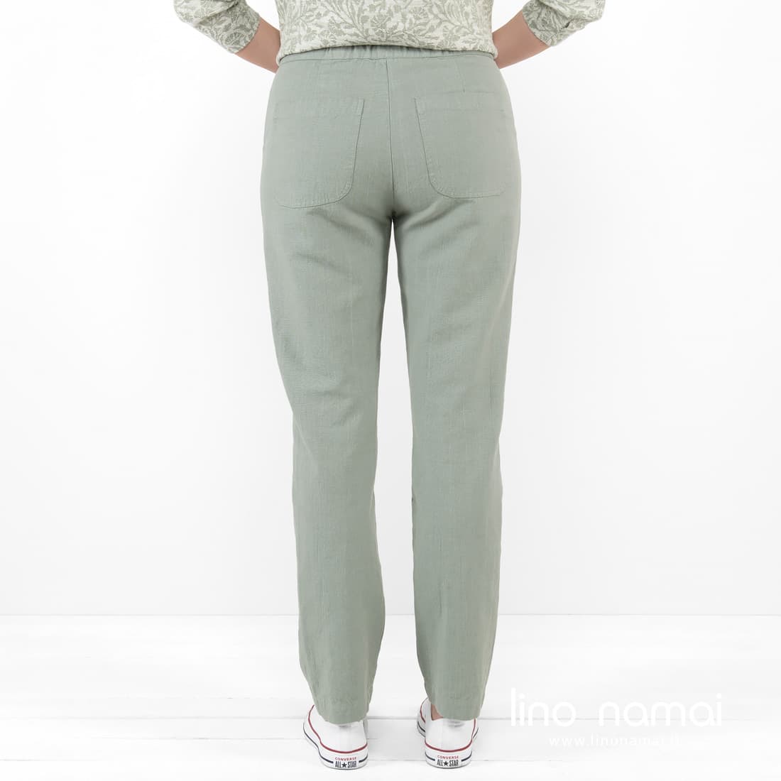 • Puslininės žalsvos kelnės, džinsų tipo.