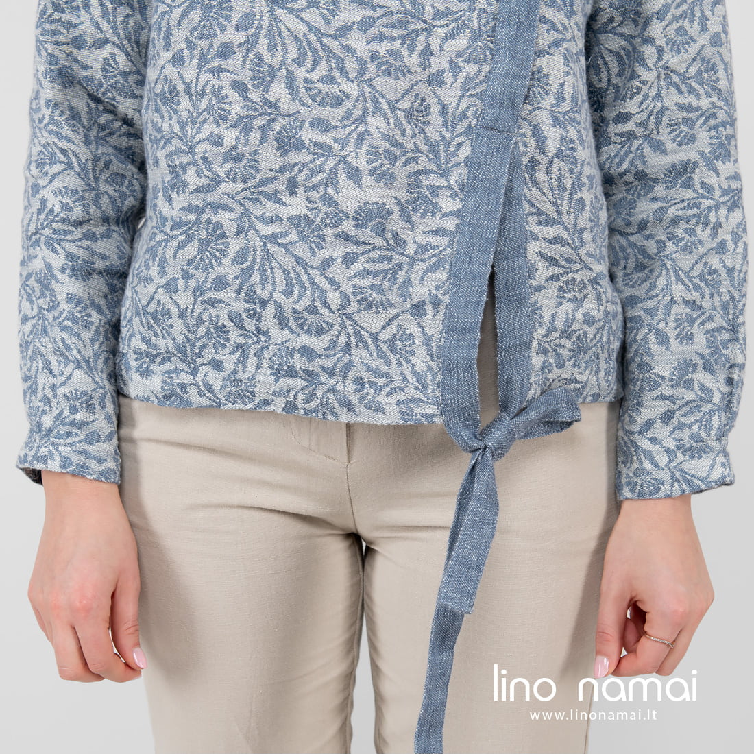 • Puslininė mėlyna palaidinė su gėlėmis iš nugaros.