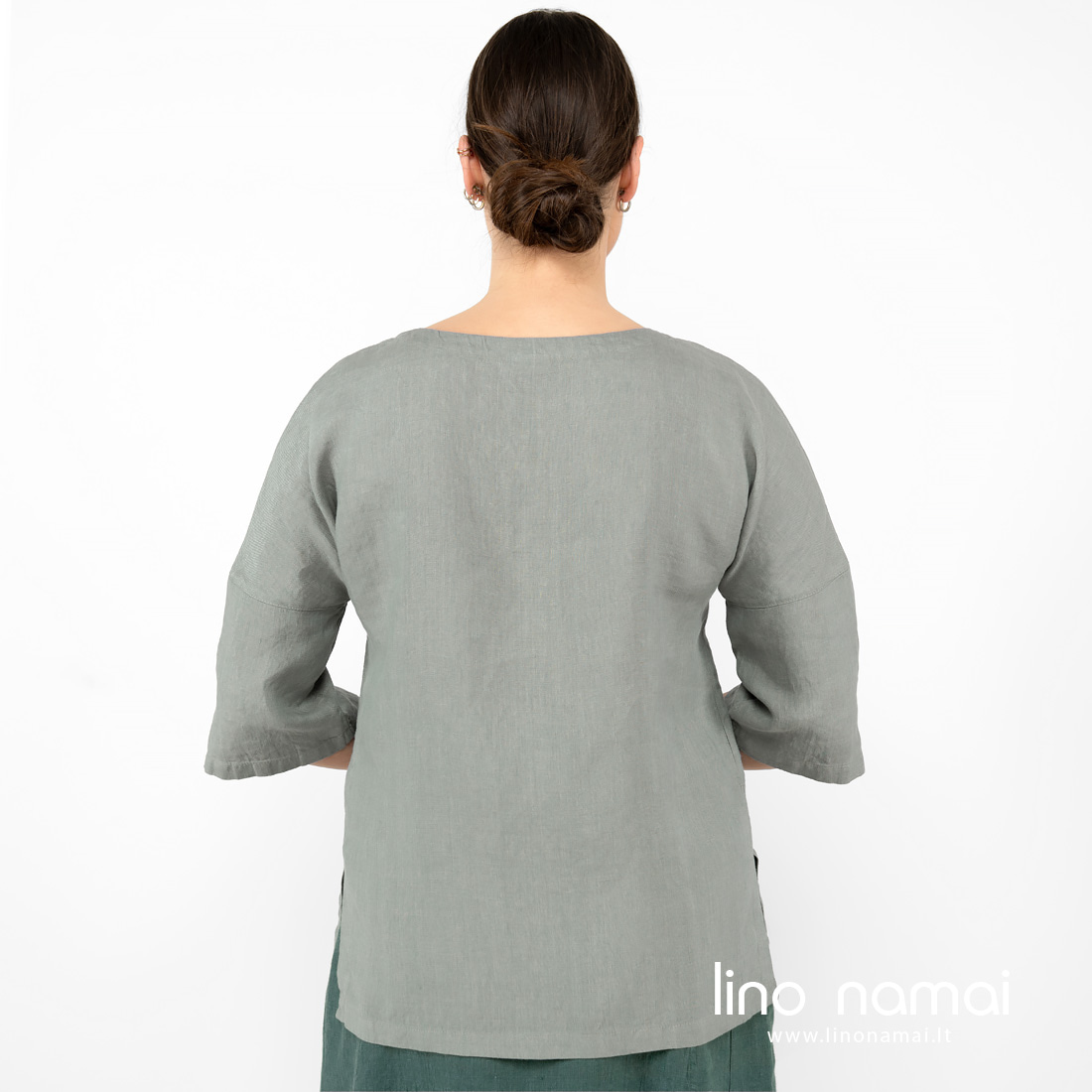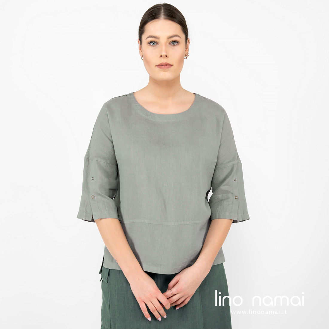 • Lininė žalsva palaidinė, 3/4 rankovės.