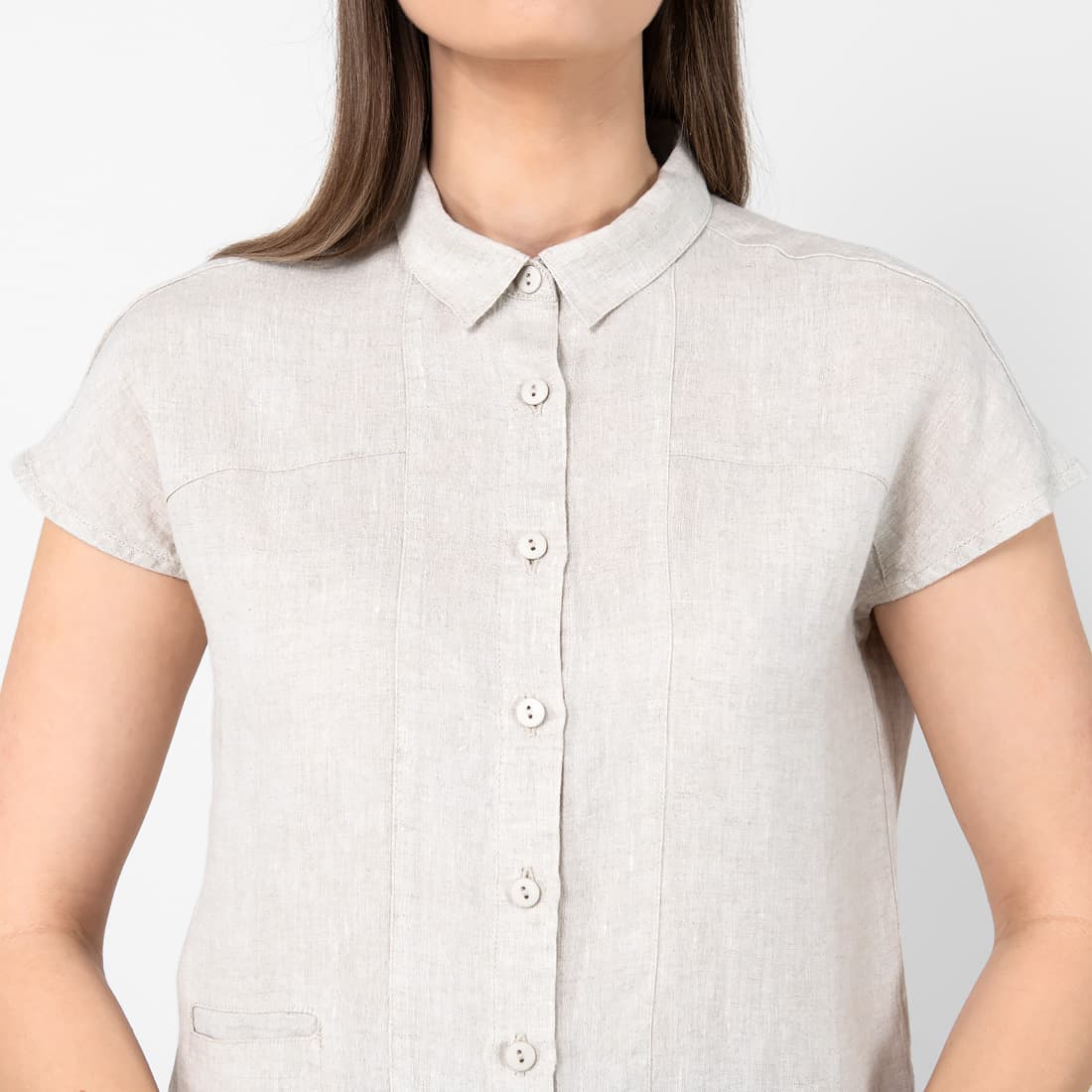 - Detalės: trumpos rankovės, susagstoma per visą ilgį, maža įleistinė kišenėlė dešinėje pusėje