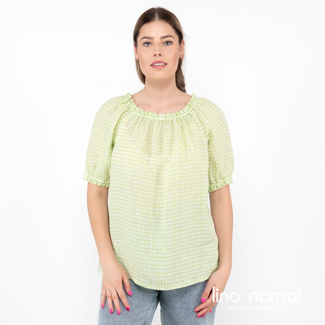 • Lininė palaidinė salotiniais ir ryškiai baltais langeliais
