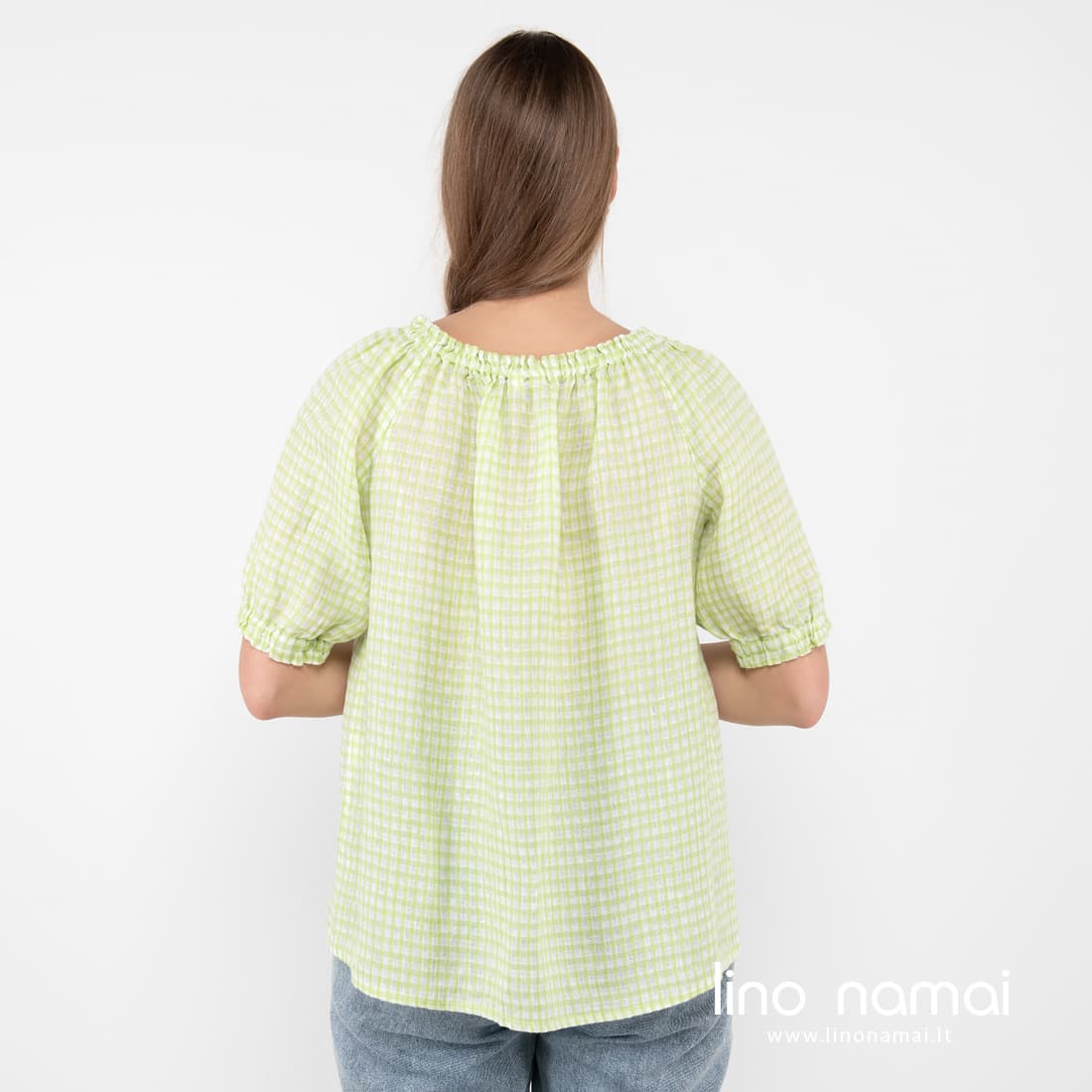 • Lininės žalsvai-baltai languotos palaidinės rankovės ir iškirptė su guma