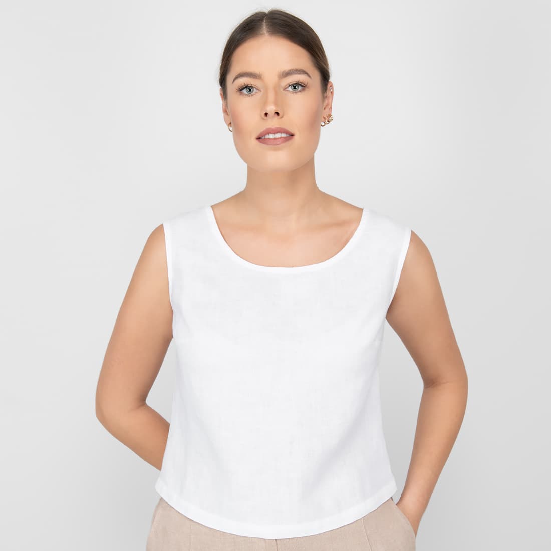 • Lininė ryškiai balta palaidinė be rankovių