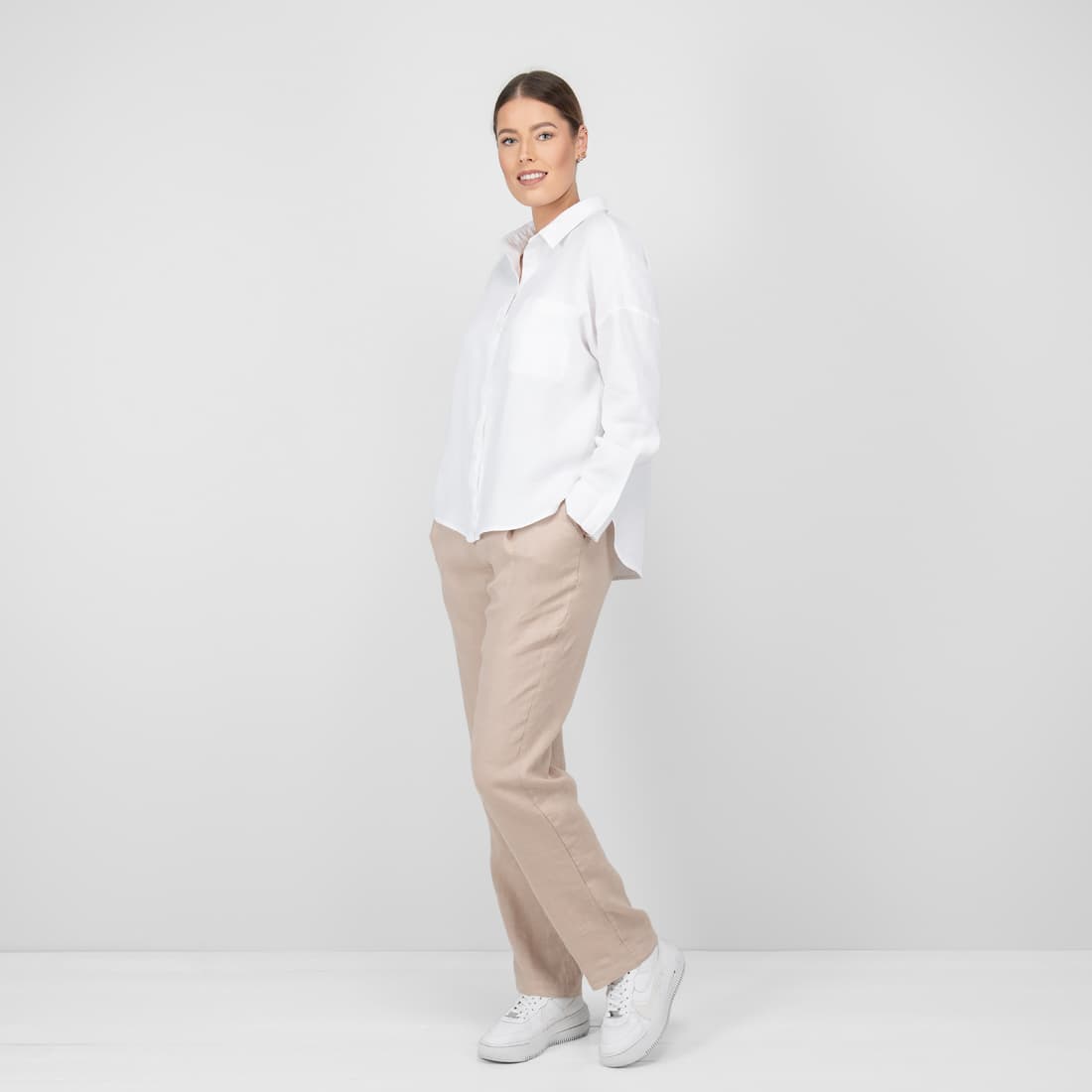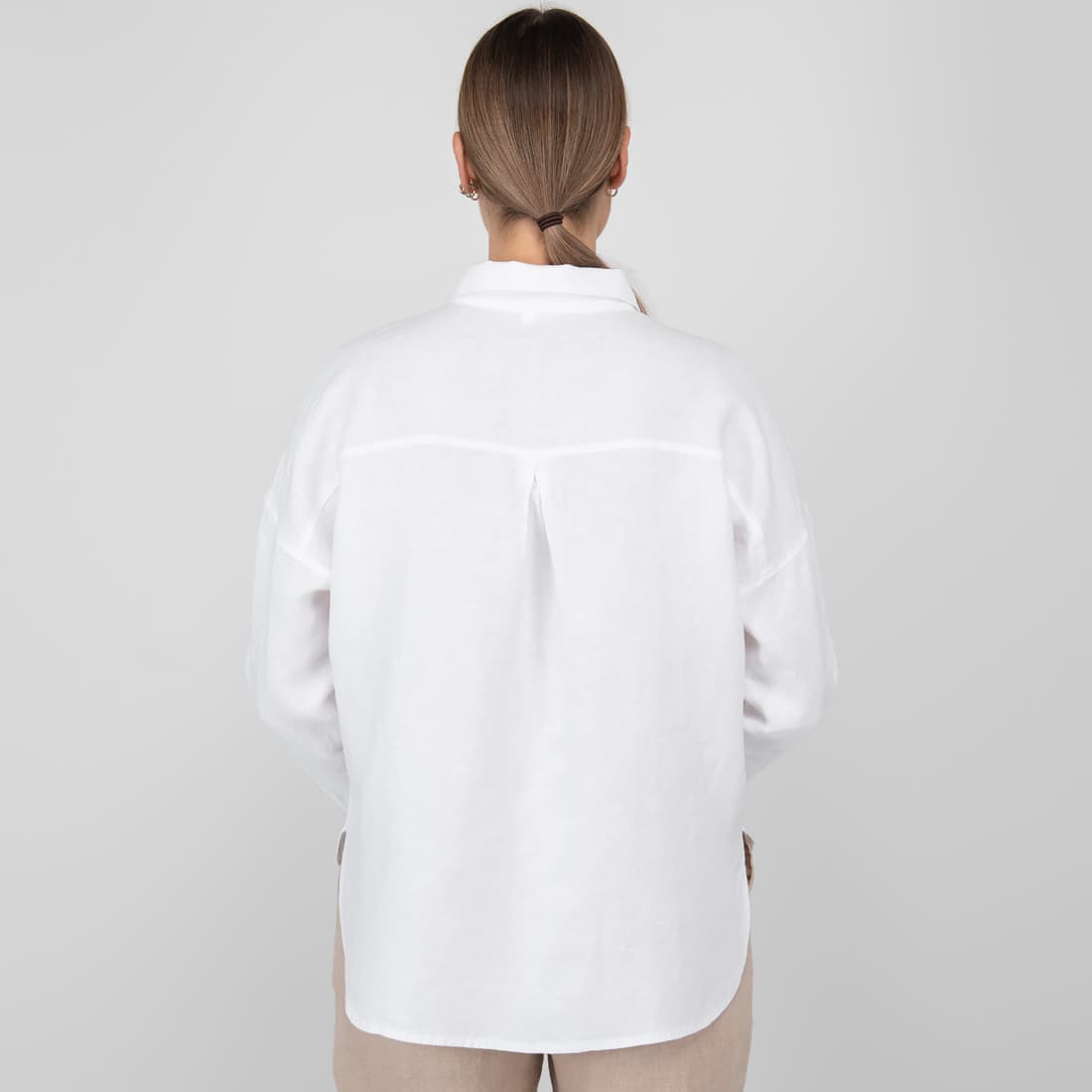 • Lininė balta palaidinė su ilgesne nei priekis nugaros dalimi
