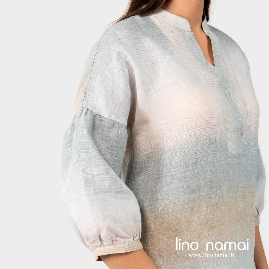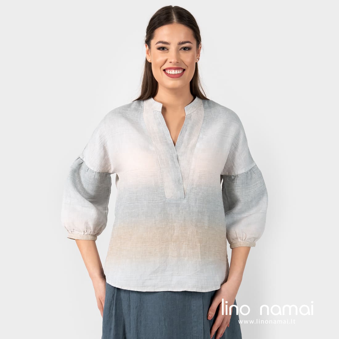 • Lininė dryžuota palaidinė su pūstomis 3/4 rankovėmis