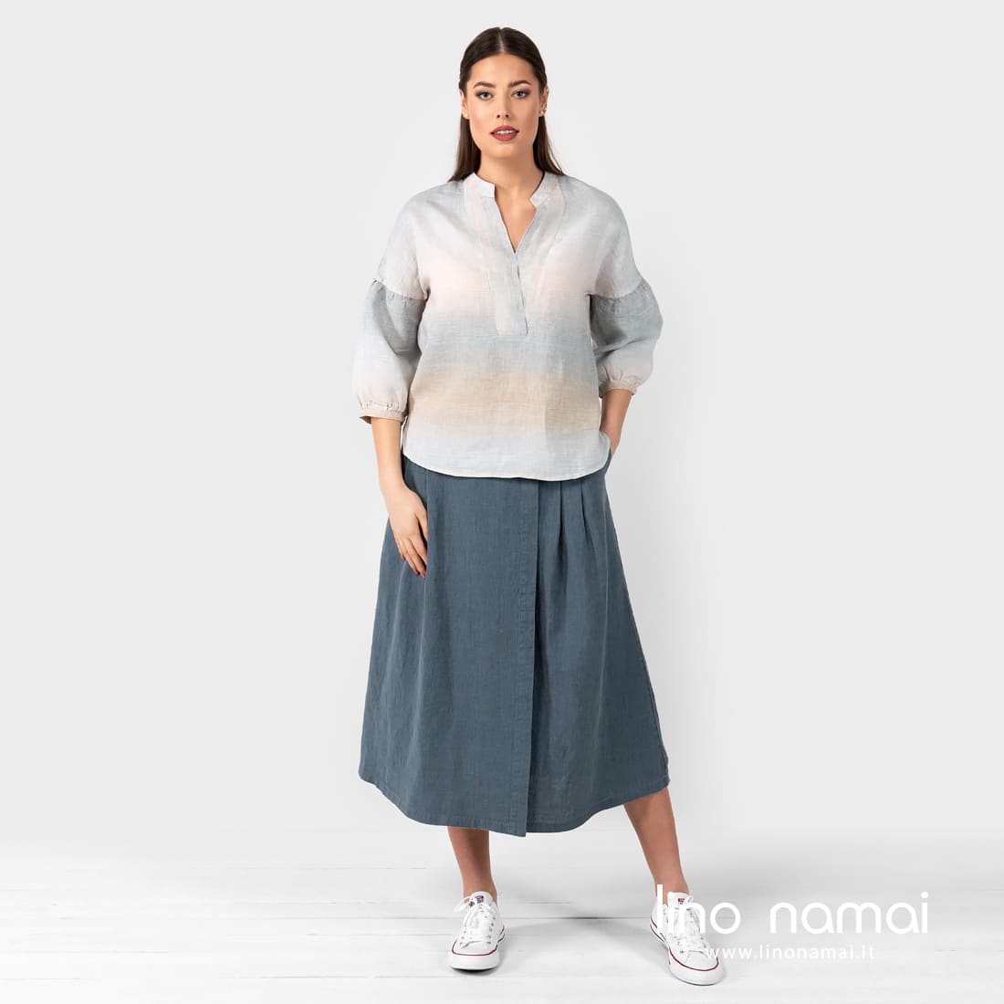 • Lininė dryžuota palaidinė PALMA ir pilkas sijonas LUNGO